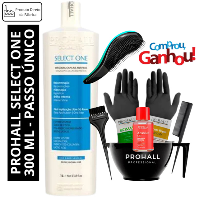 Prohall Select One Litro (Só 1 Único Passo) + Óleo e sache + Kit aplicação, Luva, Pente e Escova