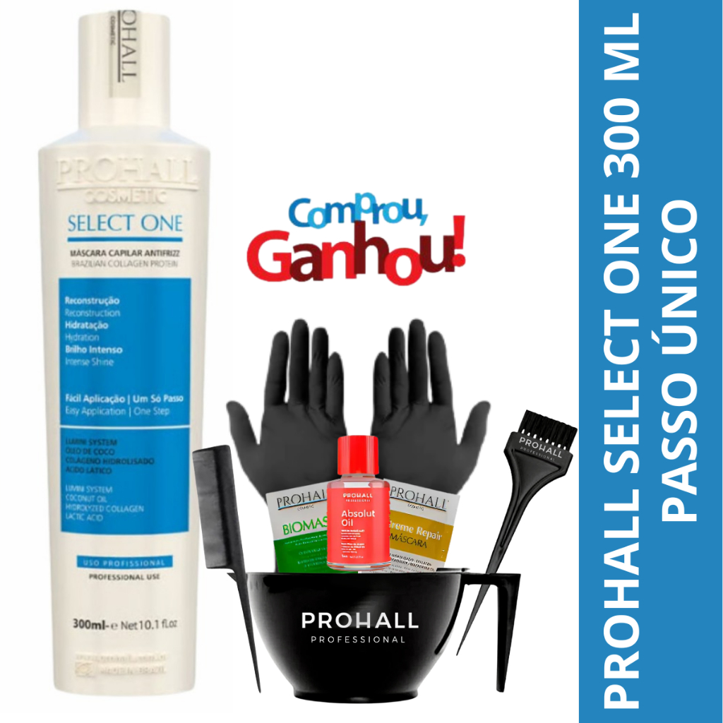 Prohall Tratamento Único Passo Select-One - 300 ml + kit aplicação Acompanha: - Prohall select - Kit Aplicação - óleo 7ml + saches (na falta do item da foto enviamos de outra marca porém com mesma qualidade) - Luva A Select One possui formulação desenvolvida com componentes de ponta, tendo o ativo Lumini System como principal pilar. O age diretamente na fibra capilar reconstruindo e reparando todos os danos provenientes de químicas e/ou agentes externos (poluição, calor, raios UV e umidade). Essas vantagens, quando somadas, garantem muito mais do que apenas fios lisos, agindo também como um tratamento aos cabelos. Veja abaixo mais alguns benefícios da Select One: - Hidratação profunda e toque macio às madeixas; - Nutrição intensa e equilíbrio da oleosidade natural; - Brilho extraordinário; - Reconstrução que promove mais força e resistência aos cabelos; - Reparação de danos causados por químicas e/ou agentes externos; - Formação de uma camada protetora em volta dos fios; - Aplicação fácil e prática. Para garantir todos esses benefícios, a Select One conta com uma tecnologia e ingredientes de ponta. O ativo inteligente Lumini System, que é o principal pilar de sua composição, é responsável pela retexturização da fibra capilar e, consequentemente, melhora a absorção de tratamentos futuros. O componente também melhora a maleabilidade dos fios, tornando-os mais macios. Já o Óleo de Coco tem a função de diminuir o frizz, controlar os fios mais rebeldes e reduzir as pontas duplas. Ademais, também cria uma camada protetora em volta do fio, auxiliando na prevenção dos danos externos. O Colágeno Hidrolisado, por sua vez, é um ativo natural que proporciona elasticidade, resistência e flexibilidade aos fios. Todos esses benefícios dão mais movimento ao cabelo e recuperam a fibra capilar dos danos sofridos no pós química.
