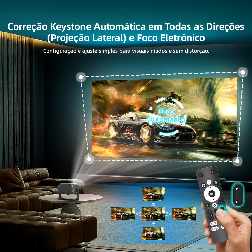 Projetor LCD de alta definição:com resolução Full HD de 1080P 4K, 500 ANSI lumens, decodificação dinâmica HDR10+ e taxa de contraste de 1500:1, o projetor oferece imagens cristalinas e brilhantes com profundidade e precisão de cor aprimoradas, dando vida a cada detalhe e proporcionando uma experiência de visualização superior. Seja para cinema em casa, jogos ou apresentações profissionais, a qualidade de imagem aprimorada tornará cada momento inesquecível! Precisão e controle sem esforço:O projetor suporta correção automática de keystone (projeção lateral), foco automático, alinhamento automático de tela e prevenção automática de obstáculos. Isso garante uma imagem perfeitamente alinhada e nítida de forma rápida e sem esforço na parede e na tela, não importa em que tipo de mesa, em que direção ou se há um objeto diante do projetor. Suporte giratório:O suporte torna o ajuste de ângulo mais flexível e conveniente. Seja projetando em uma parede ou teto, ele pode transformar qualquer espaço em uma área de visualização ideal. Além disso, ele também oferece mais estabilidade. Telas grandes e excelente qualidade de som:Apresentando uma proporção de 16:9 e uma proporção de projeção de 1.37:1, ele oferece um tamanho de imagem variando de 40 a 120 polegadas. Mesmo em uma sala pequena, uma tela grande pode ser alcançada. Enquanto isso, o alto-falante integrado de alta qualidade fornece um som rico e claro, proporcionando a você uma experiência visual e auditiva cinematográfica e transformando sua casa em um cinema particular! Máxima Conectividade e Versatilidade:Equipado com conector de áudio de 3,5 mm, portas USB e HDMI 2.1, o projetor multifuncional pode atender a várias necessidades de conectividade em diferentes ocasiões. Os dispositivos suportados incluem U Disk, discos rígidos portáteis, leitores de cartão, alto-falantes, fones de ouvido, fones de ouvido, computadores de mesa, laptops, caixas de TV, consoles de jogos PS4 e muito mais. A interface HDMI 2.1 suporta até 48 Gbps de alta largura de banda e transmissão de alta velocidade, sem atraso, lag ou queda de quadros quando conectado a consoles de jogos. Método de conexão estável e de alta velocidade:O projetor inteligente suporta Bluetooth 5.2 e WiFi 2.4G/5G de dupla frequência, permitindo conexões perfeitas de smartphones, tablets, laptops e acesso a APPs online para uma gama mais ampla de recursos de entretenimento. A avançada tecnologia Bluetooth 5.0 permite que você emparelhe com alto-falantes externos ou fones de ouvido sem esforço, e também suporta o modo de alto-falante Bluetooth, o que significa que pode ser usado como um alto-falante Bluetooth. Projetor autorizado pela Netflix:Ele suporta Netflix, YouTube, Disney, Prime Video APPs oficialmente licenciados e outros 1000+ Apps, permitindo que você assista ao seu conteúdo favorito na tela grande diretamente. Ele também vem com um controle remoto autêntico certificado pela Netflix, certificado pela Netflix, oferecendo compatibilidade de nível profundo e operação precisa e rápida. Controle de voz avançado Smart Bluetooth AI:O controle remoto também é integrado ao ChatGPT, oferecendo mais conveniência e controle de voz Bluetooth AI mais fácil. Apenas usando comandos de voz simples como ligar/desligar o projetor, reproduzir o próximo vídeo ou aumentar o volume, o projetor executará as instruções imediatamente, economizando tempo e esforço. Desempenho estável:O design fechado evita efetivamente que poeira, detritos e outros elementos externos entrem nos componentes internos e causem danos, prolongando assim a vida útil. Compacto e leve: Projetado para facilitar a portabilidade e a conveniência em ambientes externos, o projetor é compacto e leve, o que facilita o transporte e a instalação em qualquer lugar. Leve-o com você quando estiver viajando ou acampando, ele tornará sua viagem mais maravilhosa! Garantia do vendedor: 6meses