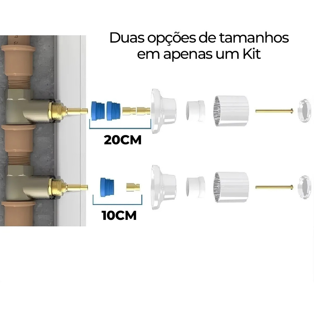 Prolongador para registro com 20mm no padrão DOCOL base Pressão ou Gaveta de 1/2", 3/4", 1", 1.1/2" ou outros fabricante com estria padrão DOCOL (20 estrias). Descrição: Os prolongadores Blukit auxiliam no conserto de instalações nas quais os registros estão embutidos (enterrados) na parede. Sendo versátil, permite que você instale o acabamento de um fabricante sobre a base do registro de outro. Teste de Qualidade: Torque Teste de resistência das conexões: Este teste avalia a resistência de roscas, porcas e conexões aos esforços (apertos) exercidos nelas durante a instalação. Realizado com o auxílio de um torquímetro, aplicam-se os esforços especificados para cada produto testado verificando-se, ao final do processo, a existência de fraturas ou cisalhamento. Pode ser instalado em: - Registro pressão 1/2" Polegada, 3/4" Polegada, 1" Polegada, 1.1/2" Polegada - Registro gaveta de 1/2" Polegada, 3/4" Polegada, 1" Polegada, 1.1/2" Polegada Material: - Plástico de engenharia (ABS) - Liga de cobre Características Gerais do Produto: Acabamento original: Permite usar o acabamento original. Tecnicamente chamado de volante. Exclusivo: Sistema exclusivo Blukit Fabricação Nacional: Produto produzido 100% no Brasil Testes de Qualidade: Produto testado e aprovado em laboratório próprio Garantia: Produto com 1 anos de garantia Manutenção sem quebrar a parede: Substituem o mecanismo de vedação sem necessidade de quebrar a parede Conteúdo da embalagem: - 01 Prolongador de registro 20mm