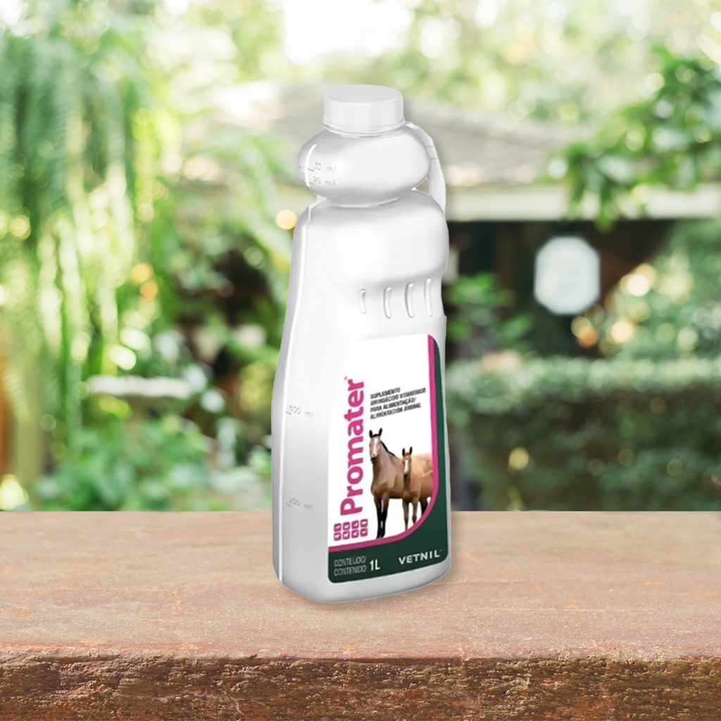 Promater Suplemento que auxilia na reprodução. Promater reúne os nutrientes para o auxilio no desempenho reprodutivo de machos e fêmeas. Indicação do produto Suplemento indicado para equinos, asininos, ovinos, caprinos, avestruzes e suínos em fase de reprodução. Indicado também para fêmeas na fase de gestação ou postura. Possui elementos fundamentais para a reprodução, entre eles, Beta-Caroteno, L-Carnitina e Ácidos Graxos, como Ômega 3 (Ácido linolênico), Ômega 6 (Ácido Linoléico) e Ômega 9 (Ácido oléico). Níveis de garantia por kg do produto Líquido Vitamina A (Mín.)……………………………………………..800.000 UI Vitamina B12 (Mín.)……………………………………………17.000mcg Vitamina E (Mín.)………………………………………………..43.000 UI Ácido Aspártico (Mín.)………………………………………………490mg Ácido Fólico (Mín.)………………………………………………………..20g Ácido Glutâmico (Mín.)…………………………………………….885mg Ácido Linoléico (Mín.)…………………………………………240.266mg Ácido Linolênico (Mín.)…………………………………………50.161 mg Ácido Oleico (Mín.)…………………………………………………118,423g Alanina (Mín.)…………………………………………………………..766mg Arginina (Mín.)………………………………………………………….536mg Fenilalanina (Mín.)…………………………………………………….196mg Glicina (Mín.)………………………………………………………….2.129mg Hidroxiprolina (Mín.)………………………………………………..698mg Histidina (Mín.)…………………………………………………………102mg Isoleucina (Mín.)……………………………………………………….128mg L-Carnitina (Mín.)………………………………………………….110,880g Leucina (Mín.)…………………………………………………………..298mg Lisina (Mín.)………………………………………………………………….10g Metionina (Mín.)……………………………………………………………10g Prolina (Mín.)…………………………………………………………1.166mg Serina (Mín.)…………………………………………………………….145mg Tirosina (Mín.)………………………………………………………….110mg Treonina (Mín.)………………………………………………………….85mg Valina (Mín.)…………………………………………………………….221mg Beta Caroteno (Mín.)……………………………………………..2.700 mg Selênio (Mín.)……………………………………………………………152mg Extrato Protéico Vegetal (Mín.)……………………………………….10g Modo de usar Líquido: Para ser usado via oral. Equinos, muares e asininos: 20 mL/dia. Suínos: 7,5 mL/dia Avestruzes: 5 mL/dia. Apresentação Frascos de 1L.