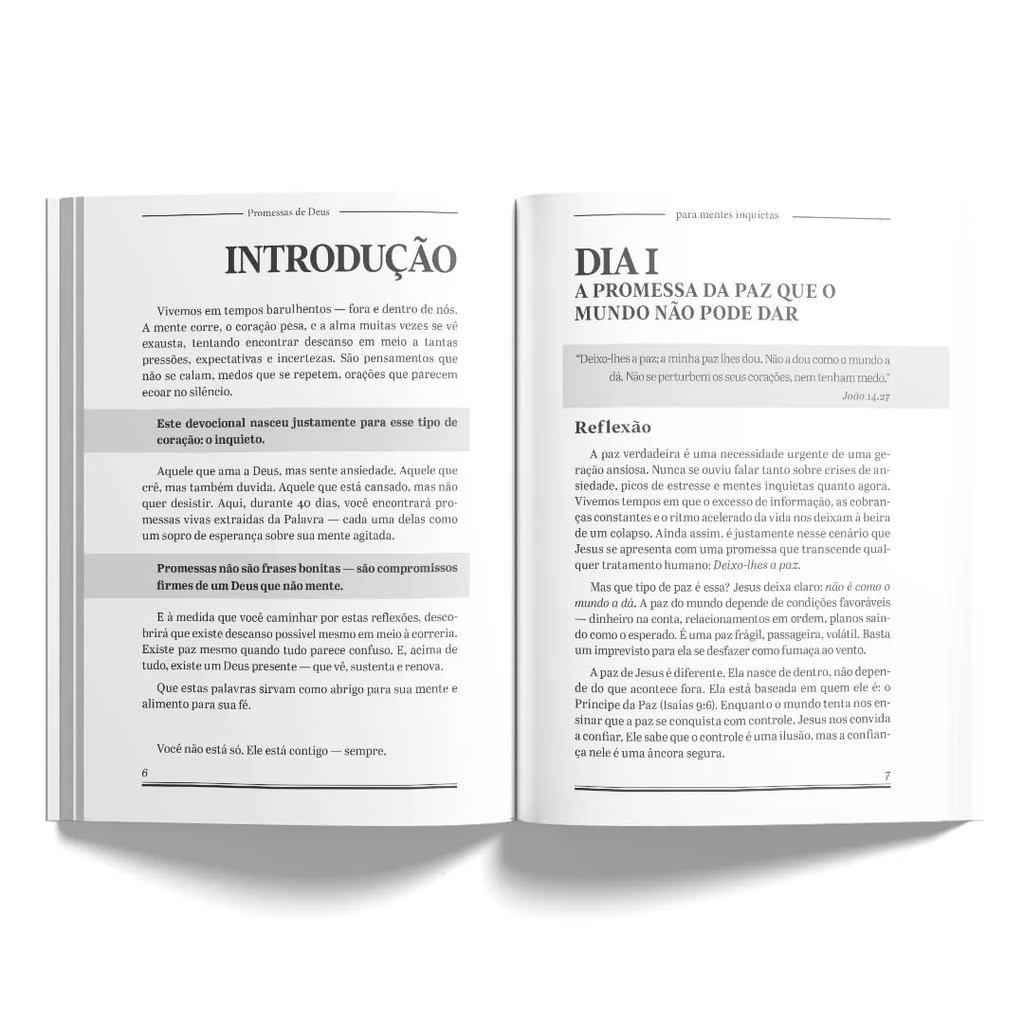 Sua mente não desliga? Encontre abrigo seguro nas promessas de Deus. Você vive com a sensação de alerta constante, tentando controlar o futuro e prevendo cenários que nunca acontecem? A ansiedade, o medo e o excesso de informação deixaram sua alma exausta, e suas orações parecem ecoar no silêncio. Não enfrente o caos sozinho. Acalme seu interior com verdades eternas. O livro "Promessas de Deus para Mentes Inquietas" é um devocional de 40 dias criado especificamente para corações agitados. Ele não traz apenas frases bonitas, mas compromissos firmes de um Deus que não mente. O que você vai viver nesta jornada de 40 dias: ?️ Segurança Espiritual: Troque a incerteza pela garantia de que Deus está no controle e age para o seu bem. ? Alívio da Sobrecarga: Aprenda a lançar sua ansiedade sobre Ele e encontre o descanso que o mundo não pode dar. ? Direção Clara: Descubra como a Palavra ilumina o próximo passo quando você se sente perdido ou confuso. ? Práticas Diárias: Cada dia inclui uma reflexão bíblica profunda e uma "Prática do dia", com ações simples para desacelerar, orar e confiar. A paz que você procura não depende de tudo estar perfeito ao seu redor, mas da presença de Quem caminha com você. 14x21cm 128 Páginas