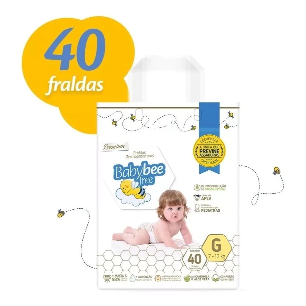 🍼 Fralda Baby Bee Free - Conforto e Proteção para o Seu Bebê! 🍼 🛍️ Anúncio referente a 1 pacote de fraldas 🛍️ 📏 Tamanhos disponíveis: ✅ P – 3 a 6 kg (📦 52 fraldas) ✅ M – 4 a 9 kg (📦 46 fraldas) ✅ G – 7 a 12 kg (📦 40 fraldas) ✅ XG – 11 a 16 kg (📦 38 fraldas) ✅ XXG – 15 a 25 kg (📦 32 fraldas) - Fralda babybee free vem com indicador de umidade - 98% transpirável - Absorve ate 480 ml - Hipoalergênicas dermatologicamente testada e aprovada - Com camomila e aloe vera - Conforto seco - Livre de APLV - Testada e recomendada por pediatras - Dermoproteção A tecnologia Dermoprotetora protege o seu bebê prevenindo assaduras e dermatites, mantendo a pele sequinha por muito mais tempo graças a função Air Confort 98% transpirável e ao extrato de Camomila, Aloe Vera e vitaminas, uma combinação exclusiva e patenteada que auxilia nos cuidados da pele. Ao utilizar as fraldas Baby Bee Free, o calor do corpo do bebê ativa a Dermoproteção hidratando a pele. Ao fazer xixi, o calor gerado intensifica a liberação da Dermoproteção, ajudando a isolar a pele da umidade. Com a temperatura mais elevada e o movimento do bebê, a loção da camada superior da fralda é transferida para a pele, formando uma película fina sobre a região íntima e uma barreira de proteção contra a umidade e outros agentes irritantes externos. Fralda Baby Bee tecnologia Dermoprotetora de fórmula patenteada com extrato de Camomila, Aloe Vera, Vitamina E, as fraldas Baby Bee Free proporcionam um excelente cuidado com a pele do bebê, formando uma película protetora que isola a pele da umidade e dispensa o uso de cremes e pomadas, atuando no ciclo da dermatite da zona da fralda, chegando a sua prevenção. Comprovado por estudos clínicos e dermatológicos.
