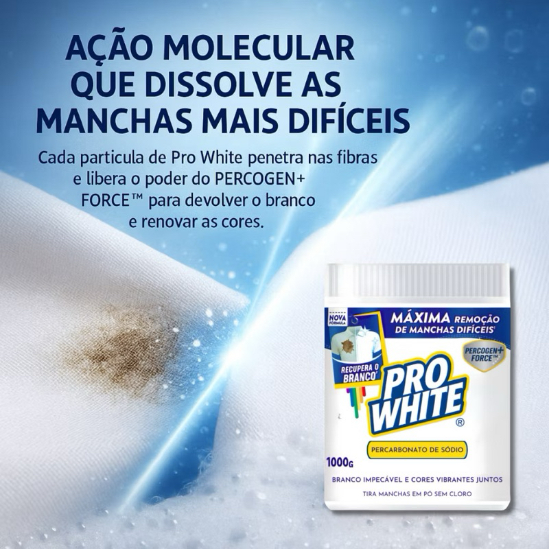 O Percarbonato de Sódio PRO WHITE é o aliado ideal para quem busca brancura impecável, higiene profunda e resultados profissionais na lavagem das roupas. Formulado com alto teor de oxigênio ativo, o PRO WHITE remove as manchas mais difíceis sem agredir os tecidos, garantindo roupas realmente limpas, renovadas e com aparência de novas por muito mais tempo. ⸻ Tecnologia de Limpeza Profunda Ao entrar em contato com a água, o percarbonato de sódio libera oxigênio ativo, que penetra nas fibras do tecido e quebra as moléculas de sujeira, gordura e pigmentos de manchas. O resultado é uma limpeza completa e natural, sem necessidade de cloro ou produtos abrasivos. ⸻ Benefícios Principais ✔ Branqueamento eficaz e seguro – devolve o branco original das roupas sem causar amarelamento. ✔ Ação tira-manchas poderosa – elimina manchas de: • Café • Vinho • Sangue • Suor • Gordura • Molhos ✔ Desodorizante natural – neutraliza odores causados por suor, mofo ou armazenamento prolongado. ✔ Produto ecológico – biodegradável, livre de cloro, corantes e substâncias tóxicas. ✔ Versatilidade de uso – pode ser utilizado em: • Roupas brancas • Panos de prato • Toalhas • Lençóis • Uniformes ✔ Ideal para uso doméstico e profissional – indicado para: • Lavanderias • Hotéis • Clínicas • Residências ⸻ Modo de Uso Lavagem na máquina Adicione 1 a 2 colheres de sopa de PRO WHITE junto ao sabão em pó ou líquido. De molho Dissolva 1 colher de sopa em 2 litros de água morna ou quente e deixe as roupas de molho por 30 a 60 minutos. Manchas localizadas Prepare uma pasta com o produto e aplique diretamente sobre a mancha antes da lavagem. ⸻ Dicas de Aplicação ✔ Use sempre com água morna para potencializar a liberação do oxigênio ativo. ✔ Não utilize em tecidos: • Seda • Lã • Couro ✔ Guarde o produto em local seco e ventilado, longe do alcance de crianças e animais. ⸻ Por que escolher o PRO WHITE? O PRO WHITE oferece desempenho superior, unindo eficiência comprovada, formulação pura e sustentabilidade ambiental. Sua ação de oxigênio ativo proporciona resultados visíveis já na primeira lavagem, mantendo a integridade dos tecidos e prolongando a vida útil das roupas. Com o PRO WHITE você garante: ✔ Branco intenso ✔ Sem cloro ✔ Sem odores fortes ✔ Sem resíduos prejudiciais ao meio ambiente A escolha inteligente para quem busca resultados profissionais com segurança. observação: O item com desconto é enviado na embalagem de A imagem do pote é ilustrativa.
