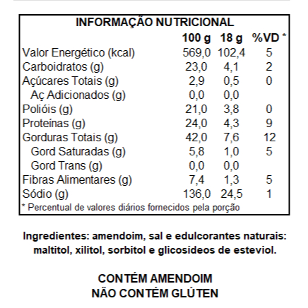 Paçoca Zero Adição De Açúcar 576G - DaColônia Apresentação: cada pote contém 32 paçocas de 18g cada, no total de 576g *** Zero Adição de Açúcares *** Adoçada de Forma 100% Natural *** Zero Glúten *** Produto Vegano Ingredientes: Amendoim, sal e edulcorantes naturais: maltitol, xilitol, sorbitol e glicosídeos de esteviol. Alérgenos: Contém amendoim. Não contém glúten. Armazenagem: Armazenar em local seco e ventilado, ao abrigo do sol e umidade, na embalagem original, fechada e protegida do contato direto com o solo. ENVIO IMEDIATO, COMPRE COM SEGURANÇA Toda compra realizada é processada em ambiente seguro. EMBALAGEM SEGURA O produto é embalado de forma absolutamente segura para evitar qualquer dano durante o transporte. ENTREGA DA MERCADORIA A entrega pode ser acompanhada diretamente no site/aplicativo onde foi feita a compra. Todo produto postado possui código de rastreamento.