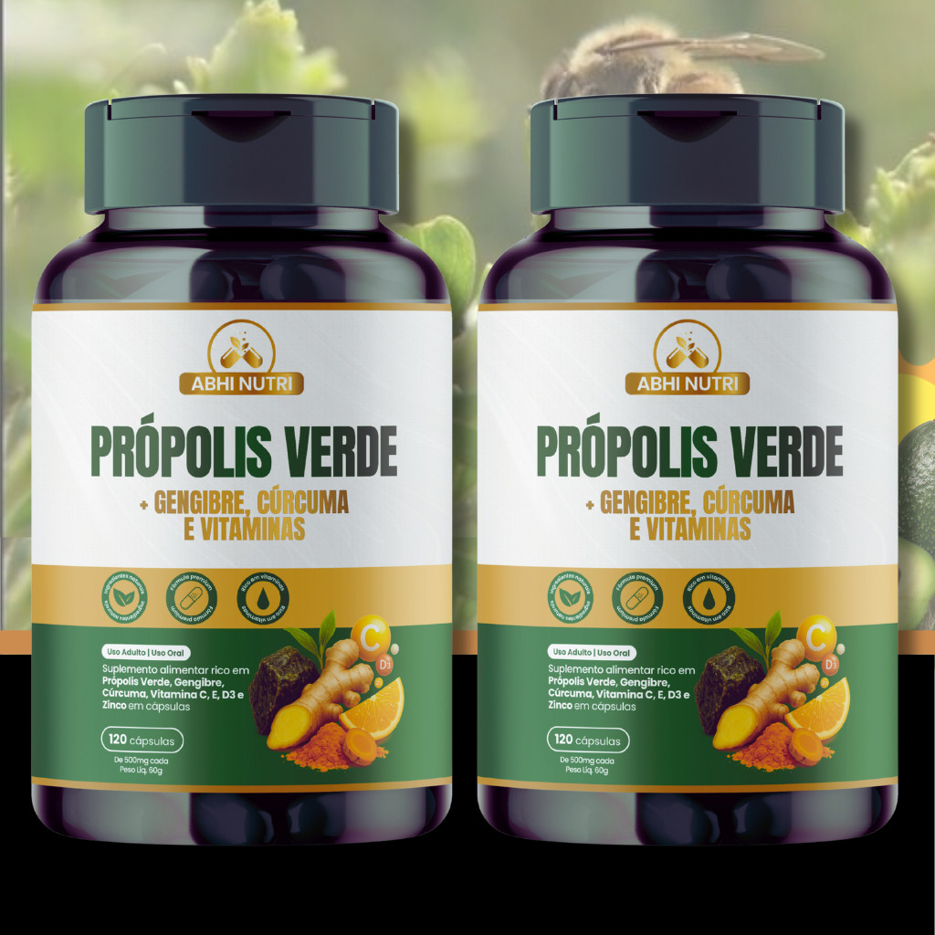 Própolis Verde+Gengibre+Cúrcuma+Vitamina C+E+D3+Zinco 120-ABHI NUTRI-500mg-Kits com 1, 2 e 3 Frascos