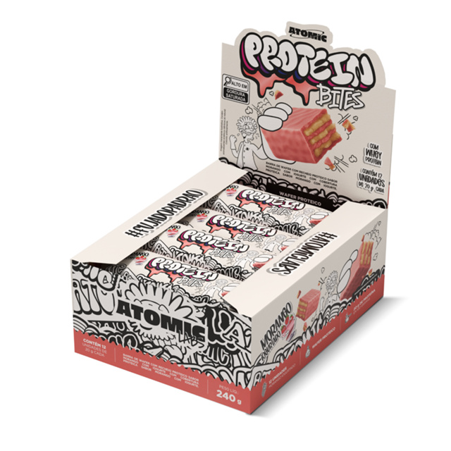 PROTEIN BITES MARCA: ATOMIC LABS Barra proteica de wafer Por que o Protein Bites é tão viciante? Porque entrega sabor, crocância e proteína num formato prático e delicioso. É o snack perfeito pra qualquer hora do dia — seja no pré-treino, na pausa do trabalho ou quando bate aquela vontade de um doce com consciência. Destaques do produto: Com Whey Protein 4g a 4,3g de proteína por unidade Zero adição de açúcares Crocante por fora, cremoso por dentro Alto teor de fibras Caixa mista = 12 unidades Atenção! Contém glúten, lactose, soja e trigo. Pode conter avelã e castanha-de-caju. Contém aromatizante sintético idêntico ao natural. Produto alto em gorduras saturadas. Armazenamento: Manter em local seco, fresco e protegido da luz. Após aberto, consumir imediatamente. Peso líquido total da caixa: 240g (12 unidades de 20g cada)