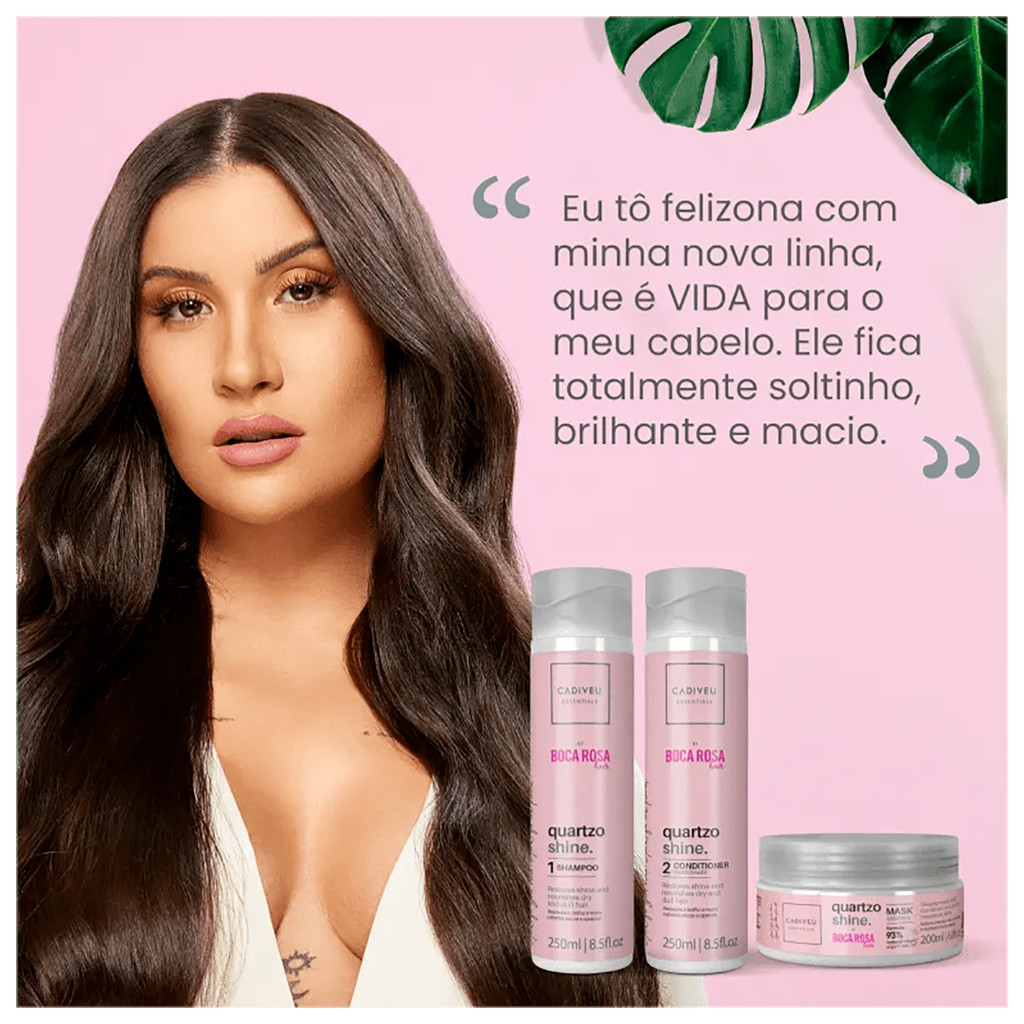 Cadiveu Essentials Quartzo Shine By Boca Rosa Hair Proteína Condicionante O Pré-shampoo Cadiveu Essentials Quartzo Shine By Boca Rosa Hair Proteína Condicionante é a nova versão do antigo Pré-shampoo Levae-in Boca Rosa Hair e o que já era bom ficou ainda melhor. Enriquecido com partículas de quartzo rosa, dá equilíbrio da raiz às pontas, proporcionando leveza e brilho tridimensional. O resultado é um cabelo poderoso, nutrido e cheio de brilho. A Proteína é um booster multifuncional doador de nutrientes para reparar e nutrir os fios, aumentando o brilho, deixando os cabelos mais macios e com aspecto saudável. Para uso em cabelos cacheados, a proteína ainda tem efeito de definição dos cachos. Esse booster poderoso é formulado com proteínas e óleos vegetais, podendo ser usado como máscara, leave-in ou como pré-shampoo, já que tem formulação leve e sem silicone, dando um toque suave aos fios. O produto tem 97% de ingredientes de origem natural, além de não fazer testes em animais. A embalagem é 100% reciclada, feita de outros frascos que já foram utilizados. Fórmula 100% Vegana. AÇÃO: Quartzo Rosa e proteína vegetal: a união desses dois ingredientes promove aquela mudança que o seu cabelo seco e opaco precisa! O resultado é muita nutrição e brilho para os seus cabelos. Extrato de aveia: se o seu cabelo precisa se salvação, esse ativo rico em aminoácidos, proporciona além de restauração, proteção, maciez e maleabilidade dos fios. MODO DE USO: Você pode usar o produto de até três formas diferentes e criar o seu próprio ritual de beleza. Como Pré-shampoo: Antes de entrar no chuveiro, aplique o produto do comprimento até as pontas, com os cabelos secos (não precisa economizar tá? A ideia é enluvar o cabelo todo!). Depois de 10 minutos de pausa é só enxaguar e iniciar o seu ritual de banho como de costume Como Máscara: Após lavar os cabelos com o shampoo, aplique o produto no comprimento e nas pontas (não precisa economizar tá? A ideia é enluvar o cabelo todo!). Depois de 3 minutos, enxaguar e seguir com o condicionador e finalização da sua preferência. Como Leave-in: Com os cabelos úmidos, aplique do comprimento até pontas e inicie o passo a passo para definição e maciez máxima.Se preferir o usar o produto como leave-in, não exagere na quantidade para não pesar nos fios.