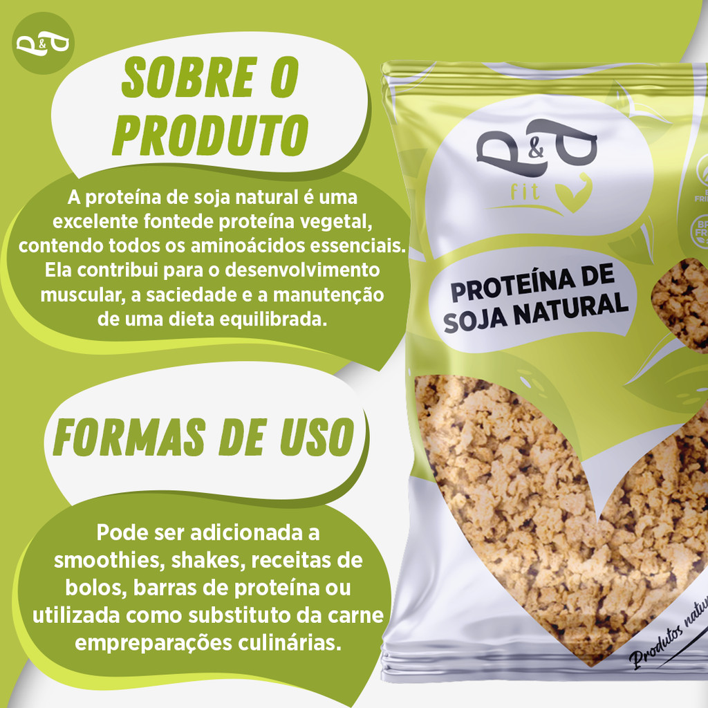 Proteína de Soja – Fonte Vegetal de Energia e Nutrição A Proteína de Soja é um suplemento alimentar de alta qualidade, ideal para quem busca uma fonte rica em proteínas vegetais para auxiliar na construção muscular e manutenção da saúde. Versátil e prática, pode ser adicionada a shakes, receitas e refeições diversas. ℹ Benefícios: - Fonte completa de proteínas vegetais - Auxilia na recuperação e ganho muscular - Baixo teor de gorduras saturadas - Ideal para dietas vegetarianas e veganas - Versátil para diversas preparações culinárias - Produto natural e sem aditivos ℹ Ficha Técnica: - Produto: Proteína de Soja - Conservação: Manter em local seco e fresco - Produto natural e pronto para uso *Imagem ilustrativa. O produto pode apresentar variações de cor, sabor e aparência, conforme as características naturais das matérias-primas e diferenças entre as safras do ano.
