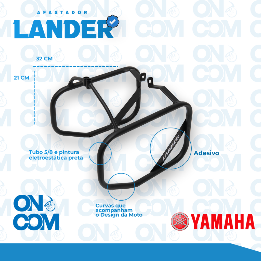 PROTETOR DE CARENAGEM LANDER - Descrição: Compatível com LANDER 2019 em diante. O protetor da marca I.Metal foi desenvolvido para proteger o motor e a carenagem da moto, sendo alinhado nos pontos de fixação acrescentando uma aparência mais esportiva na moto. - Características: Disponível na cor preto fosco e acabamento com pintura eletrostática. Confeccionado em tubo de ferro redondo 7/8 de diâmetro e parede de 1.20 com peso aproximado 3.0 KG. - Acompanhamento: Saboneteira, pedaleira retrátil e parafusos para fixação AFASTADOR DE ALFORGE LANDER - Descrição: Compatível com LANDER 2019 em diante. O afastador da marca I.Metal serve para evitar que os alforges tenha contato com o escape e roda traseira. Produto desenvolvido para acompanhar todo o design e estética da moto o que faz com que deixe a mesma com aspecto ainda maior, considerando sua fabricação testada desde os pontos de fixação até a resistência. - Características: Disponível na cor preto fosco e acabamento com pintura eletrostática. Confeccionado em tubo de ferro redondo 5/8 de diâmetro e parede de 1.20 com peso aproximado 1.5 KG - Acompanhamento: Parafusos para fixação e adesivos laterais na escrita de acordo com o modelo da moto. Atenção: Recomendamos que a instalação deve ser feita por um profissional especializado.