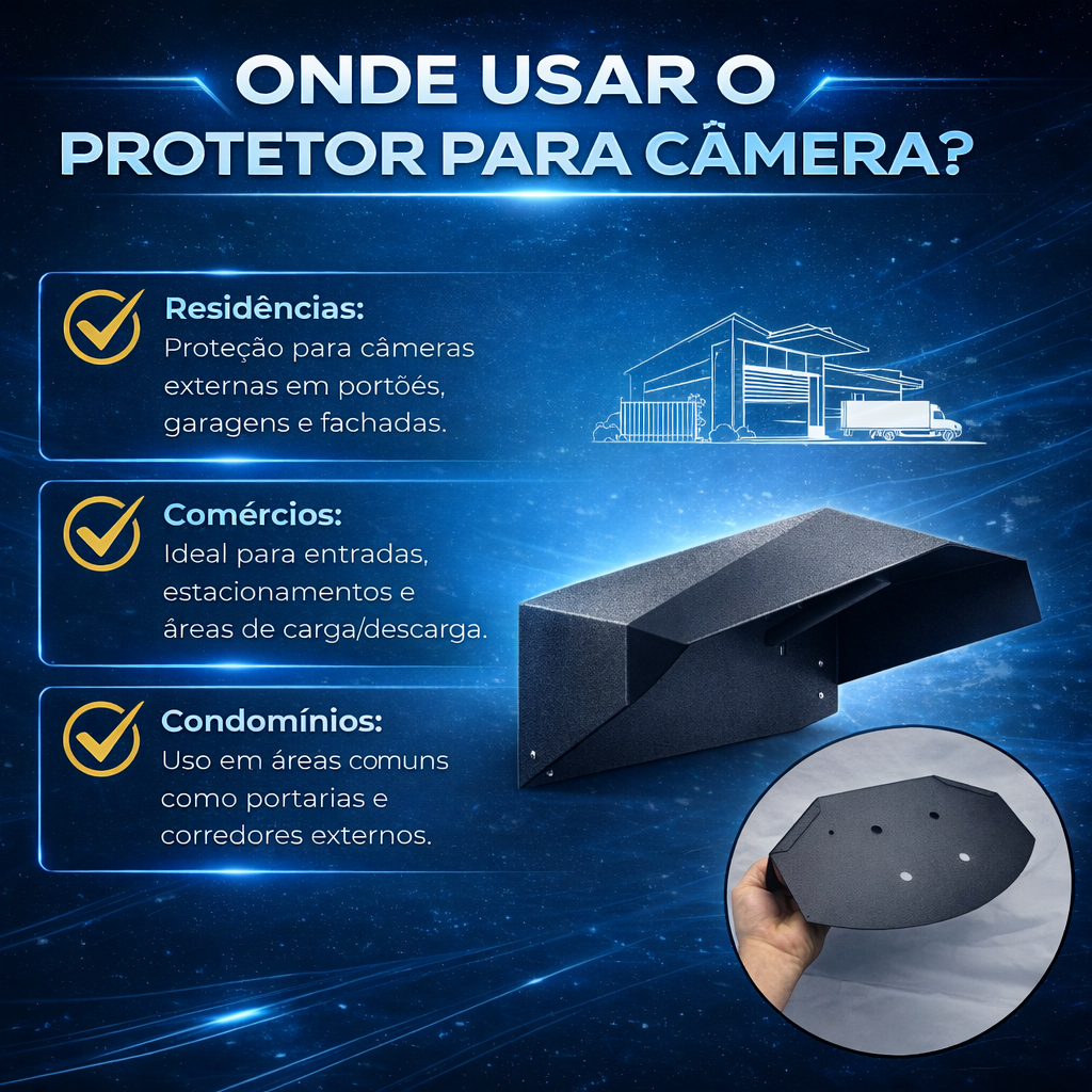 Kit com 2 Unidades – Telhado de Proteção Universal para Câmeras de Segurança Telhado de Proteção Universal em Chapa Galvanizada para Câmeras de Segurança Prolongue a vida útil da sua câmera de segurança com este telhado de proteção universal, ideal para ambientes residenciais. Fabricado em Chapa Galvanizada 0,5 com pintura epóxi, oferece resistência e durabilidade superiores, protegendo seu equipamento contra sol e chuva com eficiência. Características do Produto: Compatibilidade Universal: Pode ser utilizado com a maioria dos modelos de câmeras bullet e residenciais. Proteção Climática: Bloqueia a ação direta da chuva e dos raios solares, evitando superaquecimento e danos por umidade. Fita Dupla Face para Fixação dos fios Material Reforçado: Construído em chapa galvanizada com pintura epóxi, resistente à ferrugem e ideal para áreas externas. Instalação Rápida: Já vem com os furos e os parafusos necessários para uma fixação simples e estável. Medidas Aproximadas: Comprimento: 22 cm Largura: 26 cm Altura: 15 cm Vantagens: Protege contra sol e chuva, garantindo maior durabilidade da câmera Estrutura firme e resistente com ótimo acabamento Aparência discreta e profissional para qualquer tipo de fachada Invista em segurança com qualidade e praticidade. Este telhado de proteção é a solução ideal para quem quer proteger sua câmera com um acessório durável e funcional. Este kit com 2 telhados de proteção é a solução ideal para quem quer proteger suas câmeras com um acessório durável e funcional.