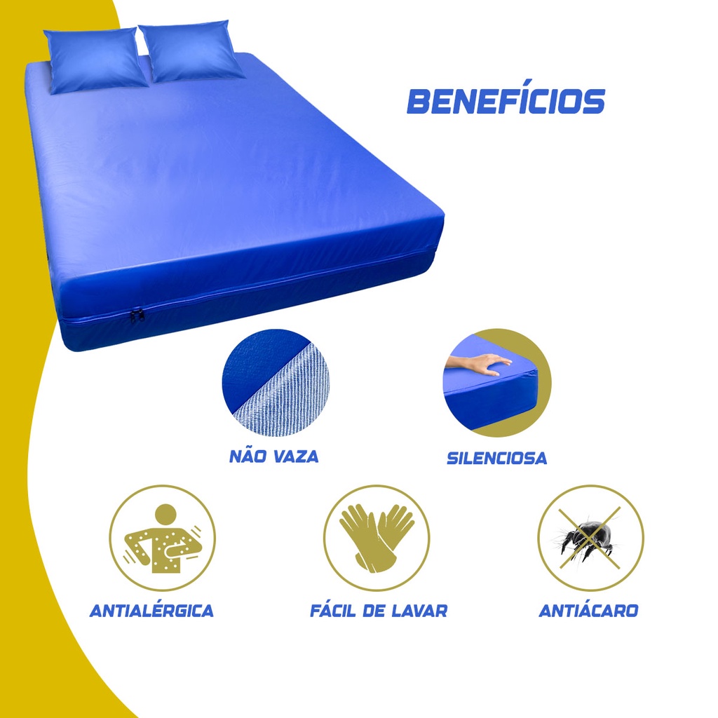 Protetor De Colchão Impermeável Casal Com 2 Fronhas Napa Premium Toque Macio Capa Impermeável Casal ✅Sobre o produto: ✔ Cor Azul ✔ Composição 100% PVC ✔ Fabricante : Irmão capas ✔ Com zíper de abertura em U ou Elástico ✅Diferencial do nosso produto: ✔ Fabricação própria, produto nacional ✔ Para a correria do dia a dia é só passar um pano úmido com detergente neutro ou álcool e sua capa estará limpa e seca rapidamente. ✔ Você terá muito mais praticidade, pois com esta capa você protegerá seu colchão por completo podendo usar seu colchão dos dois lados. ✔ Possui zíper que acompanha a largura, garantindo que você coloque e retire facilmente. Com 6 medidas diferentes para o seu colchão. ✔ A capa para colchão pode ser usada em: hospitais, clínicas, hotéis, motéis, pousadas, alérgicos, casas de repouso, casas de veraneio, casas de praia, casas de campo etc. ✔ Confeccionada em napa capa material de alta qualidade com forro interno de malha em poliéster que garante maior resistência a capa transformando o seu colchão comum em um colchão hospitalar totalmente higiênico e antialérgico. ✅Tabela de medidas: ✔ Comprimento: 188cm / Largura: 138cm / Altura: 15cm ✔ Comprimento: 188cm / Largura: 138cm / Altura: 18cm ✔ Comprimento: 188cm / Largura: 138cm / Altura: 20cm ✔ Comprimento: 188cm / Largura: 138cm / Altura: 25cm ✔ Comprimento: 188cm / Largura: 138cm / Altura: 28cm ✔ Comprimento: 188cm / Largura: 138cm / Altura: 30cm ⚠️ Atenção: Selecione a capa nas mesmas medidas de seu colchão 🚚 Envio Super Rápido 🥰 Para dúvidas, estamos à disposição no chat