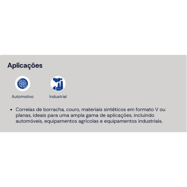 ### Protetor de Correias Car 80 250ml - PROTEGE E SILENCIA ### Cuidadosamente desenvolvido para oferecer máxima proteção e lubrificação das correias de diversos tipos de maquinário. Sua fórmula avançada elimina eficientemente os ruídos indesejados e melhora a transferência de força, resultando em um desempenho otimizado. Ao aplicar o produto, forma-se uma película aderente e duradoura que impede o deslizamento das correias, além de proporcionar uma camada protetora contra ressecamentos e quebras. Esse protetor prolonga a vida útil das correias, garantindo um funcionamento suave e seguro dos equipamentos. APLICAÇÕES Correias de borracha, couro, materiais sintéticos em formato V ou planas, ideais para uma ampla gama de aplicações, incluindo automóveis, equipamentos agrícolas e equipamentos industriais. CAR80 Com 44 anos de tradição, a linha de produtos Car 80 se renova e evolui constantemente. Sempre atenta às necessidades de cada segmento, seja no mercado da reparação automotiva, industrial ou doméstica, você pode contar com a Car 80 para facilitar a sua vida.