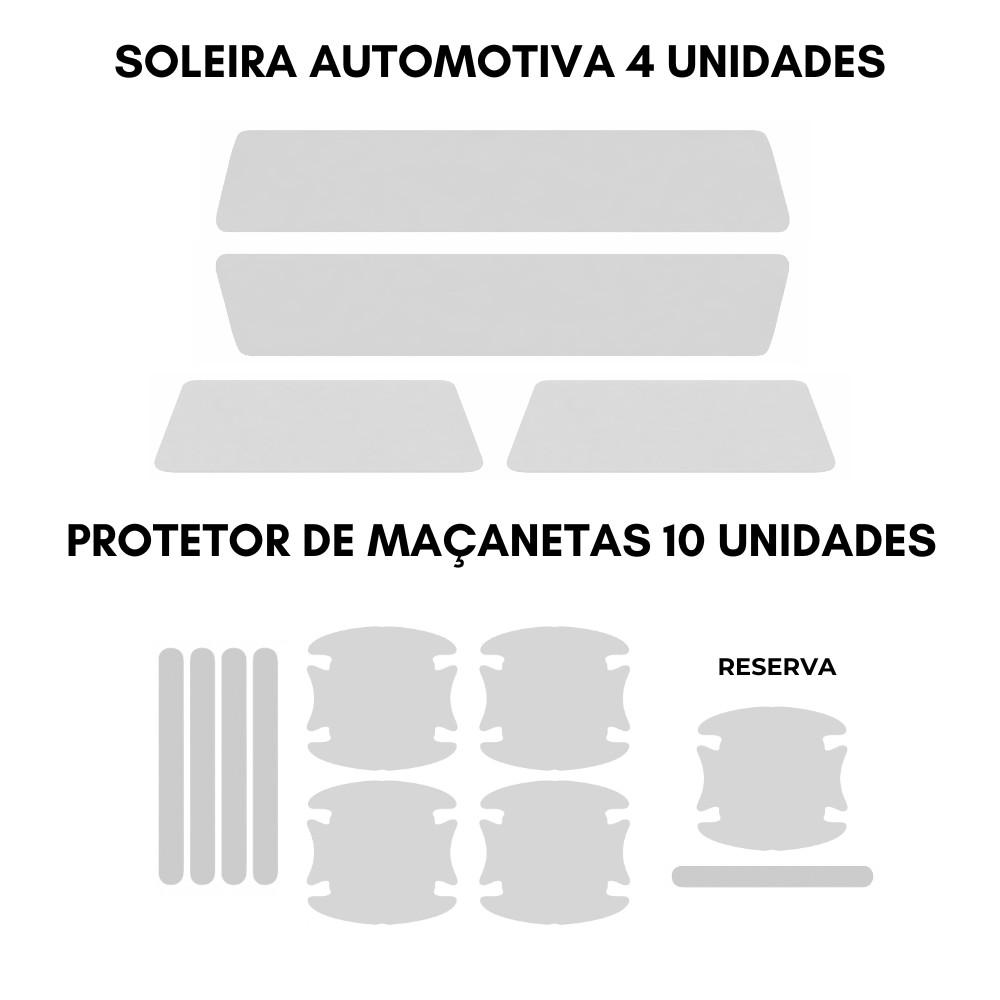 QUER REVENDER? - Entre em contato para condições especiais - Somos fabricantes ESCOLHA A OPÇÃO DESEJADA NO CAMPO DE ESCOLHAS - APENAS PROTETOR DE MAÇANETA - APENAS SOLEIRA - KIT COMPLETO COMPROTETOR DE MAÇANETAS E SOLEIRA Você Sabia? - PROTETORES RESINADOS AMARELAM EM MENOS DE 3 MESES Nossos adesivos possuem durabilidade de 7 anos expostos ao tempo - ADESIVOS MAIS FINOS SÃO MAIS EFICIENTES Nossos são mais finos para facilitar a instalação e ao mesmo tempo fornecer a proteção necessária contra arranhões. LEIA ATENTAMENTE O ANUNCIO - O MELHOR DA SHOPEE - Imperceptível, completamente transparente após a aplicação - Adesivo tecnológico, mais resistente - Formato que favorece a aplicação sem bolhas - Durabilidade de até 7 anos O protetor de maçanetas foi desenvolvido para proteger a pintura do seu veículo contra riscos causados pelo uso diário, especialmente na área da maçaneta, sem comprometer a estética original do carro. Após a aplicação, a película torna-se praticamente invisível em poucos dias e possui durabilidade de até 7 anos. O design do protetor foi cuidadosamente projetado para se adaptar perfeitamente à maioria dos veículos com maçanetas do tipo “puxador”, oferecendo ampla cobertura com aplicação facilitada. Os quatro recortes estratégicos da película permitem uma instalação precisa, mesmo em superfícies curvas, reduzindo o risco de bolhas de ar. Instruções de instalação - Modo úmido 1 . Limpe a superfície com detergente neutro e um pano úmido para remover sujeira e oleosidade. 2 . Umedeça levemente a área para facilitar o posicionamento da película. Essa umidificação facilita o posicionamento da película e permite fazer ajustes durante a aplicação. Atenção: umedecer demais o local fará com que a fixação seja mais demorada e poderá prejudicar a aplicação. 3 . Aplique a película, removendo bolhas de ar e pressionando do centro para as bordas, com o auxílio dos dedos e um pano seco. 4 . Finalize pressionando com um pano seco até a fixação completa. Instruções de instalação - Modo seco 1 . Limpe a superfície com detergente neutro e um pano úmido para remover sujeira e oleosidade. 2 . Aplique a película, pressionando de uma ponta para as bordas, com o auxílio dos dedos e um pano seco. 3 . Pode ser que esse método deixe algumas bolhas que serão suavizadas com o passar dos dias