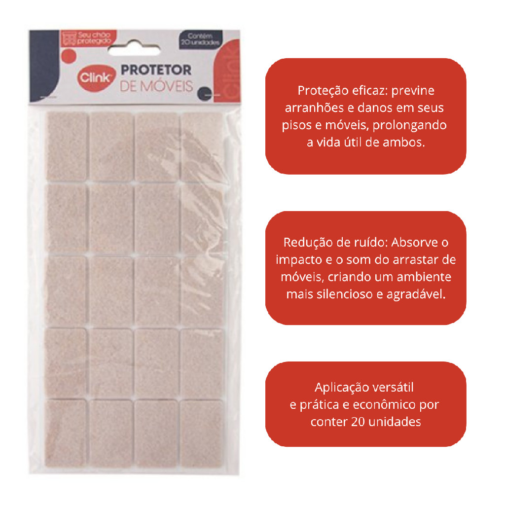 Esolha seu Modelo Protetor de Móveis Retangular 20 Peças Feltro 2,4 Cm X 4 Cm X 0,2 Cm Proteja seus móveis e pisos de riscos, arranhões e ruídos indesejados com o Protetor de Feltro Retangular CLINK. Um acessório prático, discreto e resistente que prolonga a vida útil dos ambientes, mantendo tudo mais bonito e silencioso. O kit contém 20 peças de feltro de alta qualidade, cada uma medindo 2,4 cm x 4 cm e 0,2 cm de espessura. Pode ser aplicado facilmente em diferentes móveis e eletrodomésticos, oferecendo proteção completa em diversos pontos da casa ou escritório. Lugares ideais para aplicação: Pés de cadeiras e mesas Sofás e poltronas Camas e beliches Estantes, racks e aparadores Criados-mudos, cômodas e armários Eletrodomésticos (geladeiras, fogões, freezers e máquinas de lavar) Móveis de área externa, como mesas e cadeiras de varanda ou jardim Diferenciais: Proteção eficaz: Evita danos em pisos e móveis. Redução de ruído: Diminui o som ao arrastar móveis. Aplicação prática: Fácil de fixar, com excelente aderência. Kit econômico: 20 peças para atender diferentes necessidades. Mais sobre o Produto: Produzido em feltro resistente e durável. Espessura discreta de 0,2 cm, praticamente imperceptível. Indicado para pisos delicados como madeira, laminado, porcelanato e cerâmica. Dicas de Uso: Limpe a superfície antes de aplicar para garantir a fixação. Pressione firmemente o protetor no local. Troque sempre que notar desgaste. Ficha Técnica: Nome do Produto: Protetor de Móveis Retangular 20 Peças Feltro 2,4 Cm X 4 Cm X 0,2 Cm Marca: CLINK Comprimento por Peça: 2,4 cm Largura por Peça: 4 cm Espessura por Peça: 0,2 cm Quantidade de Peças no Kit: 20 Material: Feltro Categoria: Protetores Formato: Retangular Protetor de Móveis Redondo 32 Peças Feltro 2,5 cm x 2,5 cm x 0,3 cm Proteja seus móveis e pisos contra riscos, arranhões e ruídos com o Protetor de Móveis Redondo de Feltro CLINK. Um acessório essencial para quem busca praticidade, durabilidade e cuidado com o lar. Com design discreto e eficiente, ele evita danos e mantém seus ambientes mais bonitos e silenciosos. __________________________________________________________________________________________ O kit contém 32 protetores de feltro redondos, cada um com 2,5 cm de diâmetro e 0,3 cm de espessura, ideais para aplicação em diferentes tipos de móveis e eletrodomésticos. Feitos em feltro de alta densidade, oferecem excelente aderência e resistência ao uso diário. Lugares ideais para aplicação: Pés de cadeiras e mesas Sofás e poltronas Camas e beliches Estantes e aparadores Criados-mudos e armários Eletrodomésticos diversos Móveis de varanda ou jardim Diferenciais:Protege pisos e móveis de riscos e arranhõesReduz ruídos ao mover objetosFácil aplicação e ótima fixaçãoKit econômico com 32 unidades Mais sobre o Produto: Produzido em feltro resistente e durável Espessura discreta de 3 mm, quase imperceptível Compatível com pisos de madeira, laminado, porcelanato e cerâmica Dicas de Uso: Limpe bem a superfície antes da aplicação. Pressione firmemente o protetor no local desejado. Substitua quando houver desgaste. Ficha Técnica: Nome do Produto: Protetor de Móveis Redondo 32 Peças Feltro 2,5 cm x 2,5 cm x 0,3 cm Marca: CLINK Diâmetro por Peça: 2,5 cm Espessura por Peça: 0,3 cm Quantidade no Kit: 32 unidades Material: Feltro Categoria: Protetores Formato: Redondo