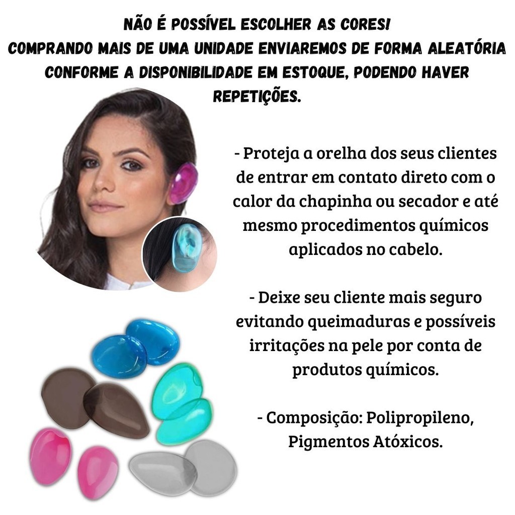 Protetor de Orelha de Silicone Tintura Chapinha E Secador 1 Par O Protetor de Orelha de Silicone foi desenvolvido para proteger a orelha dos clientes em procedimentos em casa e salões de beleza, passando a chapinha sem queimar as orelhas, fazendo aplicação de química e muitos outros procedimentos que são realizados próximos das orelhas Proteja a orelha dos seus clientes de entrar em contato direto com o calor da chapinha ou secador e até mesmo procedimentos químicos aplicados no cabelo. Deixe seu cliente mais seguro evitando queimaduras e possíveis irritações na pele por conta de produtos químicos. Composição: PVC e pigmento atóxico. Não é possível escolher as cores! Comprando mais de uma unidade enviaremos de forma aleatória conforme a disponibilidade em estoque, podendo haver repetições.