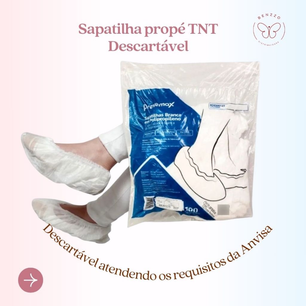 Sapatilha Protetor Propé Descartável Tnt Elástico com elástico DESCRIÇÃO Protetor para calçado fabricado em TNT 20 gramas, formado por fibras de polipropileno tamanho único. Contém um elástico em suas bordas COMPOSIÇÃO 100% polipropileno. Elástico composto por poliéster e poliamida. INDICAÇÕES Atua na prevenção da contaminação por fatores externos transportados pelos calçados de agentes que transitam de um determinado ambiente ao outro. como pessoas que trabalhem na área da saúde, fábricas farmacêuticas e alimentícias e ou outros ambientes. APLICAÇÕES Hospitais | Laboratórios | Clinicas | Consultórios | Dentistas | Farmácias Química | Têxtil | Cosmética | Procedimentos Industriais Restaurantes | Confeitarias | Cozinhas Industriais | Bufês | Congêneres Sobre o produto: • Original. • Lacrado de fábrica. • Com garantia. • Alta Qualidade. Marca conceituada no mercado. • Com registro na ANVISA. • Resistente.