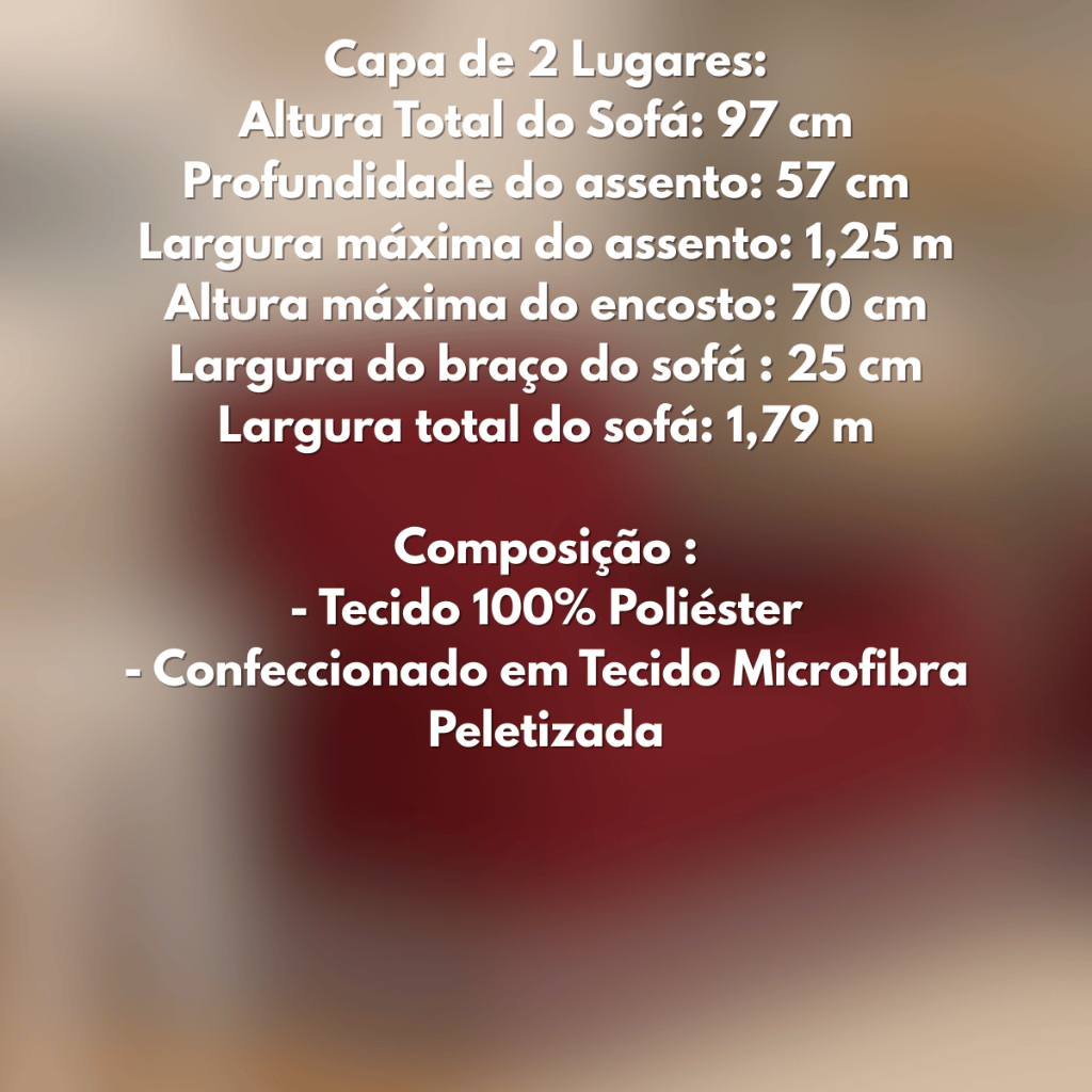CAPA PARA SOFÁ 3 LUGARES: Altura total do sofá: 97cm Profundidade máxima do assento: 57cm Largura máxima do assento: 170cm Altura máxima do encosto: 70cm Largura do braço: 27cm Largura total: 224cm Composição: Tecido 100% Poliéster Dúvidas Frequentes: - Quais Cores Disponíveis ? R: Temos 6 cores disponíveis. Tabaco, Avelã, Azul, Cinza, Preto e Vermelho - A capa cobre atrás do sofá ? R: A capa se encaixa perfeitamente no sofá mas não contém a parte de trás coberta. - Contém elásticos ? R: Não contém elásticos. - Como é realizado o processo de envio ? R: Ao finalizar a compra, fazemos o processo o mais rápido possível, enviando seu pedido no mesmo dia !! Entrega super rápida. Precisando de mais ajudas, nos mande uma pergunta e vamos te responder tirando todas suas dúvidas. Desde já, agradecemos pela preferência e estamos a sua disposição ! Garantia do vendedor: 30 dias