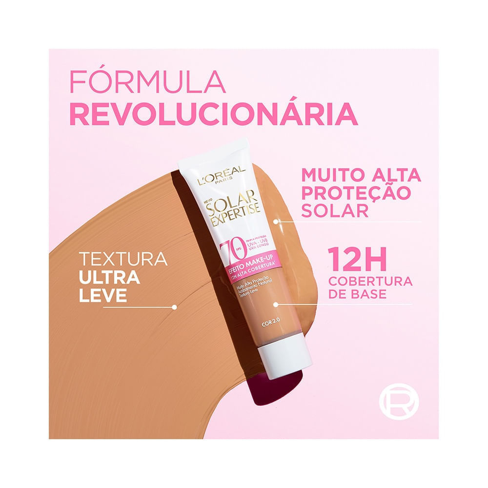 Protetor Facial Loreal Solar Expertise Efeito Make Up 2.0 Fps70 30g Para que serve? O Protetor Solar Facial L'Oréal Solar Expertise Efeito Make-Up FPS 70 combina alta proteção solar com cobertura de maquiagem, em uma fórmula inovadora que garante pele uniforme, protegida e com acabamento natural. Ideal para quem busca praticidade na rotina, ele reúne o cuidado de um protetor solar com a performance de uma base de alta cobertura. Com tripla proteção contra os raios UVA, UVB e UVA longo, o produto protege intensamente contra queimaduras solares, manchas e sinais do envelhecimento precoce, ao mesmo tempo que disfarça imperfeições com uma textura leve, não oleosa e confortável. Sua fórmula 2.0 entrega até 12 horas de cobertura uniforme e é perfeita para todos os momentos do dia, desde o trabalho até um compromisso especial ao ar livre. Como usar? Com a pele limpa e seca, aplique o produto uniformemente sobre o rosto antes da exposição ao sol. Para garantir máxima proteção, reaplique sempre após transpiração excessiva, mergulho ou ao longo do dia. Benefícios Alta cobertura com efeito base e acabamento natural FPS 70 com tripla proteção solar UVA, UVB e UVA longo Cobertura uniforme por até 12 horas Não craquela, não pesa e não deixa a pele oleosa Textura leve, confortável e de rápida absorção Substitui a base de maquiagem no dia a dia Dermatologicamente testado Resultados comprovados por quem usa 95% afirmam que o produto não deixa a pele pegajosa nem oleosa 94% garantem que não craquela nem pesa na pele 95% consideram a cobertura perfeita como maquiagem 9 em cada 10 pessoas dizem que substituíram a base tradicional pelo produto Indicação Indicado para todos os tipos de pele, especialmente para quem deseja um protetor solar facial com cor, alta cobertura e toque seco.