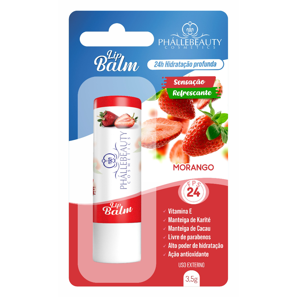 Lançamento Lip Balm FPS24 Phállebeauty Super Lançamento Lip Balm FPS24 Phállebeauty Hidratação Profunda - Vitamina E - Manteira de karité - Manteiga de cacau - Livre de parabenos - Alto poder de hidratação - Ação antioxidante Uso externo. O Lip Balm FPS 24 oferece cuidado e proteção. Enriquecido com manteiga de karité, cacau e Vitamina E, possui propriedades antioxidantes e é ideal para hidratar a pele delicada dos lábios a qualquer hora do dia. informações do produto COMPOSIÇÃO (INCI/ PORTUGUÊS): COPERNICIA CERIFERA CERA, CYCLOPENTASILOXANE, OZOKERITE, CANDELLILA CERA, CETYL ALCOHOL, SYNTHETIC BEESWAX, TRIMETHYLSILOXYSILICATE/DIMETHICONE CROSSPOLYMER, VANILLA PLANIFOLIA FRUIT EXTRACT, BUTYROSPERMUM PARKII BUTTER, RICINUS COMMUNIS SEED OIL, PHENOXYETHANOL, TOCOPHERYL ACETATE, POLYGLYCERYL- 3 RICINOLEATE/POLYGLYCERYL-3 OLEATE/GLYCERYL OLEATE/GLYCERYL ROSINATE/CANDELILLA CERA, DIETHYLAMINO HYDROXYBENZOYL HEXYL BENZOATE, ETHYLHEXYL METHOXYCINNAMATE,THEOBROMA CACAO SEED BUTTER, PARFUM. PODE CONTER OS CORANTES: CI 45380, CI 77891, CI 15880, CI 45370, CI 77019, CI 44090, CI 60725.PT/BR: CERA DE CARNAÚBA, SILICONA, CERA DE OZOQUERITA, CERA DE CANDELILA, ALCOOL CETÍLICO, CERA DE ABELHA SINTÉTICA, TRIMETILSILOXISILICATO/ CROSPOLÍMERO DE DIMETICONA, EXTRATO DE BAUNILHA, MANTEIGA DE KARITÉ, ÓLEO DE RÍCINO, FENOXIETANOL, VITAMINA E, LANOLINA VEGETAL, BENZOATO DE DIETILAMINO HIDROXIBENZOILO HEXILO, METOXICINAMATO DE OCTILA, FRAGRÂNCIA. PODE CONTER OS CORANTES: CORANTE VERMELHO 45380, DIÓXIDO DE TITÂNIO, CORANTE VERMELHO 15880, CORANTE LARANJA 45370, MICA, CORANTE VERDE 44090, CORANTE VIOLETA 60725.