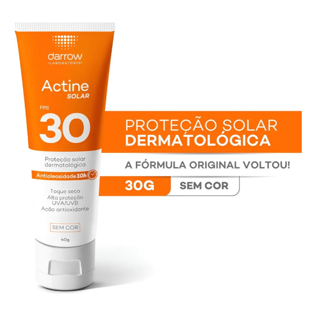 ALTA PROTEÇÃO CONTRA OS RAIOS UVA/UVB! Apresentamos o Protetor Solar Actine sem Cor da Darrow, uma excelente opção para peles oleosas e com acne. Com FPS 30, oferece alta proteção contra os raios UVA/UVB, além de apresentar ação antioxidante com vitamina E. Sua fórmula leve e de absorção imediata proporciona um toque seco, garantindo até 10 horas de proteção antioleosidade. Livre de parabenos e perfume, não obstrui os poros e é hipoalergênico, sendo ideal para uso diário. Além disso, promove uma uniformização em diferentes tipos de pele e é um produto não comedogênico que oferece uma proteção completa e segura, sem deixar a pele oleosa. Produto não testado em animais, promovendo um cuidado consciente e responsável. ------------------------------------------------------ ATENÇÃO: *Antes de iniciar o uso, remover o lacre para abrir a tampa. *Não usar se o lacre estiver violado. *Aplique abundantemente antes da exposição ao sol. *Reaplicar sempre, após sudorese intensa, nadar ou banhar-se, secar-se com toalha e durante exposição ao sol. *É necessária a reaplicação do produto para manter a sua efetividade. *Se a quantidade aplicada não for adequada, o nível de proteção será significativamente reduzido. *Ajuda a prevenir as queimaduras solares. Aviso legal • Idade mínima recomendada: 6 meses. Garantia de fábrica: 30 dias