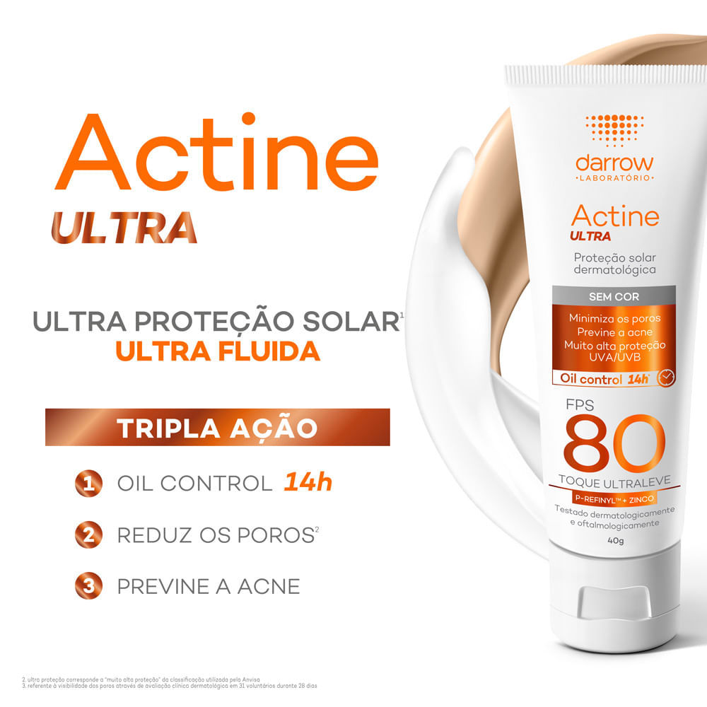 Protetor Solar Actine Ultra FPS 80 Sem Cor 40g Actine, a linha expert em pele oleosa, mais prescrita pelos dermatologistas, possui uma linha completa de produtos desenvolvidos especialmente para peles