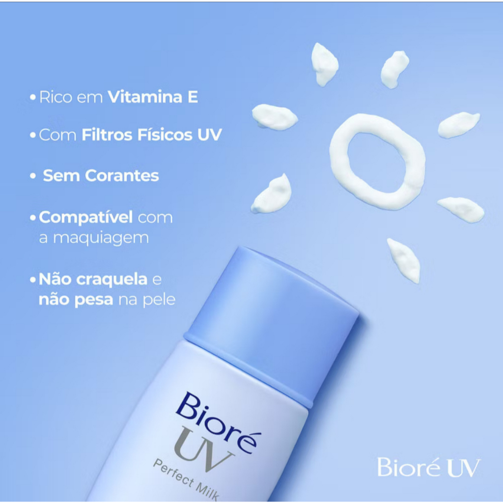 O Bioré Perfect Milk FPS 50 é um protetor solar de alta proteção solar (FPS 50) indicado para uso facial e corporal. Ele possui uma textura leve tipo “milk”, ou seja, uma emulsão fluida e delicada, que proporciona sensação confortável na pele. Seu acabamento é de toque seco (“toque seco”, “efeito matte” ou “skin‑like dry finish”), ideal para quem não gosta de sensação pegajosa ou oleosa. Principais benefícios Proteção UVB e UVA alta, ajudando a prevenir queimaduras, manchas e envelhecimento precoce. Toque seco / efeito matte: ajuda a controlar brilho e oleosidade, deixando a pele com sensação mais sequinha. Textura fluida e rápida absorção na pele. Resistente à água e ao suor: mantém proteção e sensação de conforto mesmo quando há transpiração ou em contato com água. Sem corantes / fragrância em algumas versões ou descrições, o que pode ser uma vantagem para peles sensíveis. Ajuda na fixação da maquiagem em algumas situações e pode funcionar como “primer” leve antes da maquiagem.
