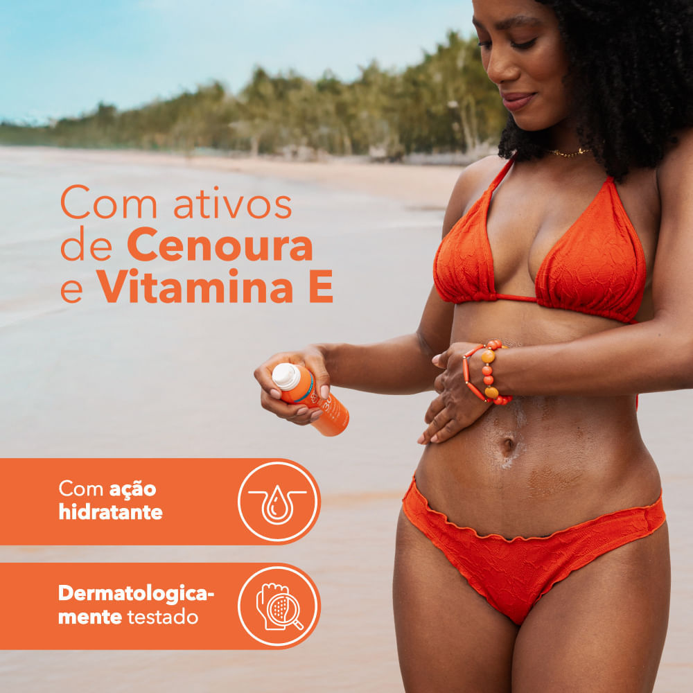 O Protetor Solar Cenoura Bronze Aerosol FPS 30 foi desenvolvido com uma tecnologia inovadora que minimiza os danos mais profundos na pele causados pelos raios infravermelhos, devido a ação antioxidante do produto, mesmo quando não estiver diretamente exposto no sol. Além disso, protege contra a vermelhidão, ardência e rugas causadas pelo exposição solar. Previne o envelhecimento precoce e a perda da firmeza e elasticidade, preservando o colágeno. O Protetor Solar Cenoura Bronze Aerosol FPS 30 possui alta proteção às camadas mais profundas da pele contra os danos causados pela exposição ao sol. É resistente à água ou suor. Modo de usar: Aplique abundantemente antes da exposição ao sol. É necessária a reaplicação para manter a sua efetividade, principalmente após sudorese intensa. Certifique-se de que o produto foi aplicado por toda a área a ser exposta ao sol. Use em ambientes bem ventilados. Agite antes de usar e mantenha o frasco sempre na vertical, com a válvula para cima ou para baixo.