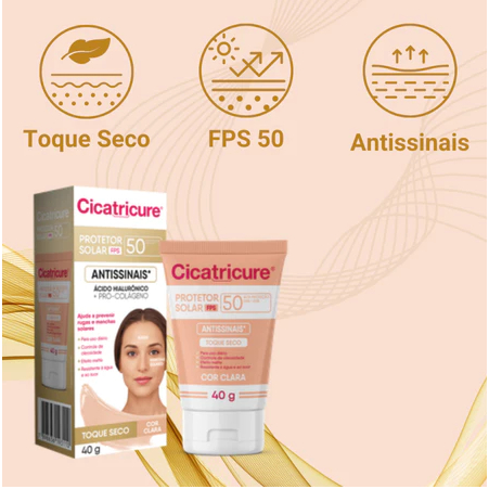Uma nova tonalidade de Cicatricure Protetor Solar Antissinais FPS 50: Cor Clara! Ideal para uso diário, proporciona alta proteção UVA e UVB. Com Ácido Hialurônico e Pró-Colágeno, proporciona cuidado antissinais, ajudando a prevenir os sinais visíveis do fotoenvelhecimento, como rugas, linhas de expressão e manchas solares. Com proteção, cuidado antissinais e tonalidade, complemente ainda mais sua rotina de cuidados faciais. Partículas absorvedoras de oleosidade contribuem para toque seco e efeito matte instantâneo Tonalidade para cobertura de longa duração, com aspecto leve e natural Fórmula resistente à água e ao suor Testado dermatologicamente