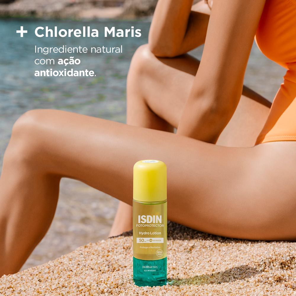 Protetor Solar Corporal ISDIN HydroLotion FPS 50+ 200ml O Fotoprotector ISDIN Hydrolotion é um protetor solar corporal bifásico que oxigena a pele e protege contra os danos causados pela exposição sol