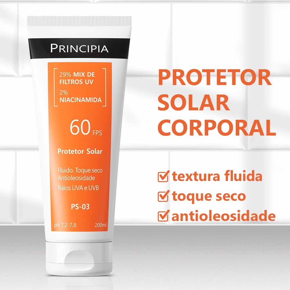 Protetor solar corporal fluido antioleosidade com 29% de filtros UV e 2% de niacinamida, FPS 60, toque seco e eficácia contra raios UVA e UVB, luz visível e azul. INDICAÇÕES Principais »Proteger contra a luz visível e azul »Proteger contra o sol »Controlar a oleosidade »Promover hidratação »Reduzir e uniformizar a pigmentação Tipos de pele »Todos MODO DE USO » Use diariamente antes da exposição ao sol » Aplique abundantemente sobre a pele seca » Reaplique sempre após sudorese intensa, nadar ou banhar-se, secar-se com toalha e durante a exposição ao sol » Mantenha fora do alcance de crianças » Em caso de contato acidental com os olhos, enxaguar abundantemente » Havendo irritação, suspenda o uso e procure por orientação médica INGREDIENTES ATIVOS NIACINAMIDA Forma estável de vitamina B3 capaz de entregar diversos benefícios para a pele, tais como redução de acnes e cravos e controle da oleosidade, comprovados em estudos publicados em diversos médico-científicos. É um precursora dos cofatores NADH (nicotinamida e adenina dinucleotídeo) e NADPH (fosfato de nicotinamida e adenina dinucleotídeo), que em suas formas reduzidas agem como coenzimas em dezenas de reações bioquímicas. FILTROS UV Ingredientes que absorvem ou refletem raios UVA e UVB protegendo a pele contra danos causados pela exposição ao sol tais como aparecimento de manchas, queimaduras solares, envelhecimento prematuro e câncer de pele. DÚVIDAS FREQUENTES Contém parabenos, petrolatos ou silicones? Não. Sua composição também não inclui corantes, fragrância nem glúten. Está regularizada na Anvisa? Sim, conforme o processo número 25351.803889/2023-25. Causa descamação da pele? Em geral, não provoca descamação visível da pele. Foi testada em animais? Não. A PRINCIPIA não realiza testes em animais. Qual o prazo de validade? Três anos, contados da data de fabricação. Pode ser usada junto com outras fórmulas? Sim. Praticamente não há restrições para uso conjunto com outros ativos. Causa acnes ou cravos? Não. Pelo contrário, costuma ter efeito benéfico e ser recomendada para peles acnêicas.