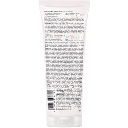 Protetor Solar Corporal Sun Fresh FPS 70 200ml - NeutrogenaIndicado para todos os tipos de pele, inclusive para pele extremamente sensível ao sol. O Protetor Solar Corporal Sun Fresh FPS 70 200ml – Neutrogena possui fórmula ultraleve como hidratante e alta proteção invisível na pele, muito resistente a água e ao suor. Sua fórmula possui a tecnologia Helioplex® XP, que proporciona uma solução altamente eficaz contra os raios UVA/UVB. Sua fórmula com antioxidante, traz proteção imediata mantendo a pele protegida, hidratada e sequinha.Dica de aplicação Aplique abundantemente antes da exposição ao sol e reaplicar constantemente, especialmente após sudorese intensa, nadar ou banhar-se, secar-se com toalha e durante a exposição ao sol. Reaplicar a cada 2 horas para manter a efetividade da proteção solar. Uso diário. Conservar em local fresco e ao abrigo da luz solar direta.PrecauçõesUso Externo. Evite contato com os olhos. Caso isso aconteça, enxágue-os com água em abundância. Descontinue o uso se surgirem irritações na pele. Se a quantidade aplicada não for adequada, o nível de proteção será significativamente reduzido. O produto ajuda a prevenir as queimaduras solares, mas não oferece nenhuma proteção contra a insolação. Evite exposição prolongada das crianças ao sol. Para crianças menores de 6 (seis) meses, consultar um médico. Conserve fora do alcance das crianças. Em contato com tecido, pode causar manchas.IngredientesAqua/água purificada, Homosalate/homossalato, Octocrylene/octocrileno, Butyl Methoxydibenzoylmethane/avobenzona, Methylene Bis-Benzotriazolyl Tetramethylbutylphenol/metileno bis-benzotriazolil tetrametilbutilfenol, Glycerin/glicerol, Aluminum Starch Octenylsuccinate/octenilsuccinato de amido alumínio, Diisopropyl Adipate/adipato de di-isopropila, Ethylhexyl Triazone/etilexil triazona, Potassium Cetyl Phosphate/cetil fosfato de potássio, , Jojoba Esters/ésteres da jojoba, Amyl Cinnamal/amil cinamal, Benzyl Salicylate/salicilato de benzila, Sodium Hydroxide/hidróxido de sódio, Limonene/dextrolimoneno etc._x000d_ Imagens Meramente Ilustrativas. Todas as InformaçõesDivulgadas são de Responsabilidade Exclusiva do Fabricante/fornecedor.