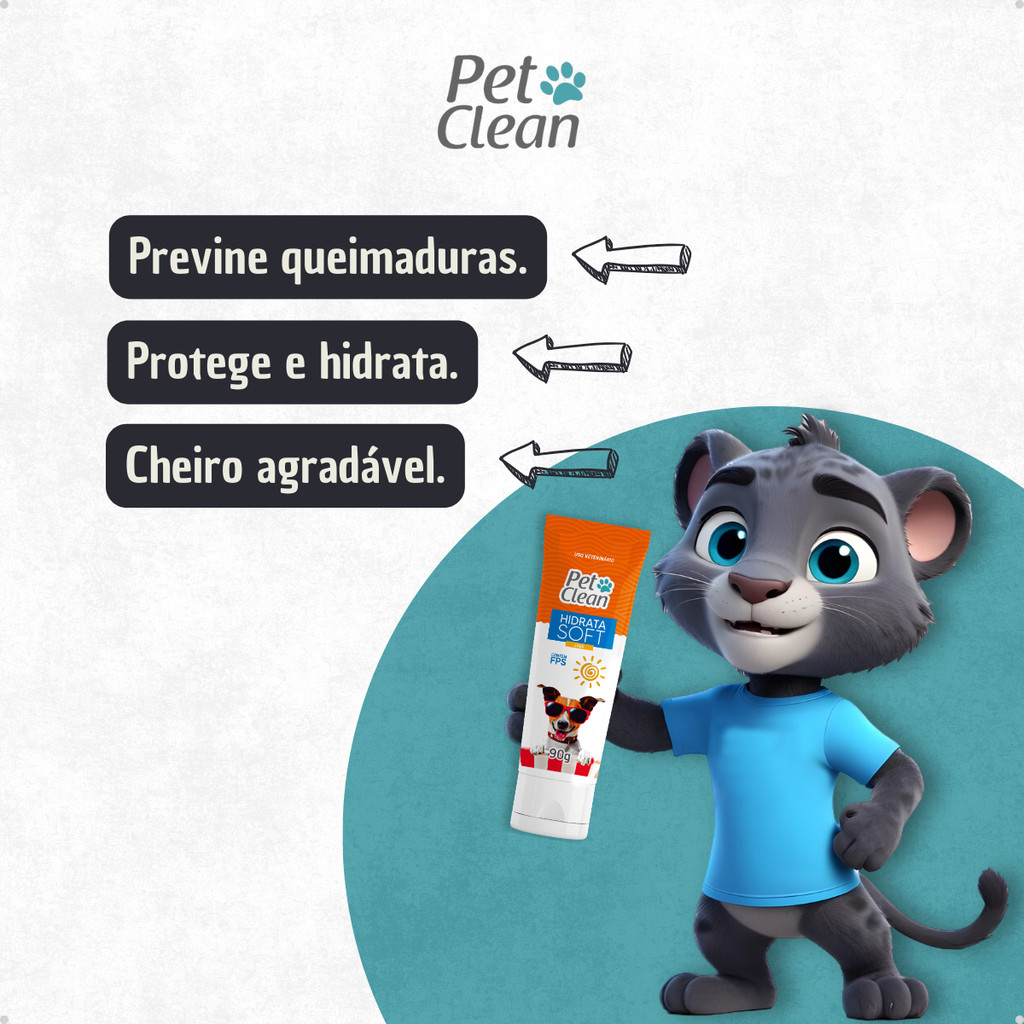 Sabia que seu pet precisa de proteção UV assim como nós? Proteja seu pet do sol nos passeios e nas idas à praia ou piscina com o Protetor Solar Termo Hidratante da Pet Clean!! Ideal para passar no focinho, barriguinha, orelhas e as áreas que possuem menos pelos. Possui FPS e extrato de aveia para seu pet aproveitar o dia de sol com tranquilidade e proteção, mantendo os pelos e a pele hidratada. Indicado para todas as raças e idades, inclusive para filhotes acima de 3 meses. BENEFÍCIOS DO TERMO HIDRATANTE PARA CÃES PET CLEAN: - Previne queimaduras; - Possui fator de proteção 30fps; - Protege as partes mais sensíveis; - Não tem cheiro forte; - Protege e hidrata. INFORMAÇÕES TÉCNICAS: Produto: Protetor Solar Termo Hidratante Para Cães Pet Clean – 90g Marca: Pet Clean Tipo: Higiene Animal: Cachorros Porte: Pequeno, Médio e Grande. Acima de 3 meses. Raça Específica: Não Sexo Específico: Não Itens Inclusos: 1 Protetor Solar Termo Hidratante Para Cães Pet Clean – 90g Apresentação: Embalagem de Plástico Composição: Glicerina, goma xantana, extrato de aveia, emulsionante, surfactante, filtro UV, emoliente, óleos vegetais, conservantes e veículo. MODO DE USAR Aplique uma fina camada sobre as regiões desejadas. Reaplique após o contato prolongado com a água. PRECAUÇÕES Evite contato com os olhos e mucosas do animal. Manter longe de alimentos e produtos domésticos. Manter em locais secos, fora do alcance de crianças e animais domésticos. Não utilizar em filhotes com menos de 3 meses de vida.