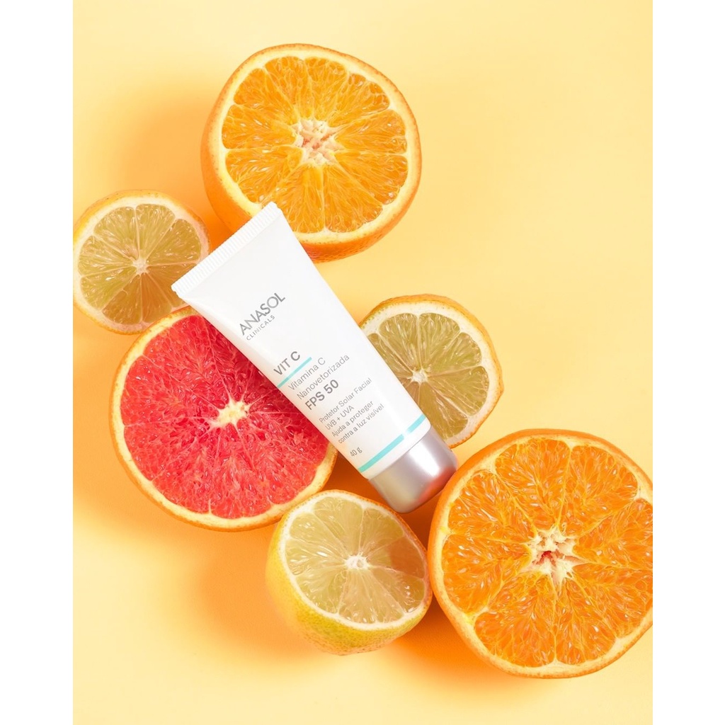 Protetor Solar Facial Anasol Com Vitamina C Fps 50 - 40g - Vegano Protetor solar de toque seco e efeito matte, que previne o fotoenvelhecimento e tem potente ação antioxidante e hidratante. O ativo atua na prevenção e tratamento dos processos de envelhecimento precoce da pele, aumentando a síntese de colágeno, promovendo firmeza e uniformização do tom da pele com ação clareadora, por estar microencapsulado permite melhor permeação e liberação do ativo na pele. Contém Nanovetor Vitamina C, além de filtros solares de última geração que protegem contra os raios UVB e UVA. Ajuda a proteger contra a luz visível e minimiza os danos na pele causados pelos raios Infravermelhos devido à ação antioxidante do produto. Resultados clinicamente comprovados: • 85% Reduz rugas e linhas de expressão2 • 95% Pele mais clara e uniforme2 • 95% Pele mais macia e hidratada2 • 95% Pele mais viçosa e luminosa2 • 95% Pele mais jovem e rejuvenescida2 Modo de Usar: • Agite antes de usar. • Uso diário. • Uso externo. • Aplique abundantemente antes da exposição ao sol. • Reaplicar sempre, após sudorese intensa, nadar ou banhar-se, secar-se com toalha e durante a exposição ao sol. • Oferece alta proteção. • Resistente à água. • É necessária a reaplicação do produto para manter a sua efetividade. • Se a quantidade aplicada não for adequada, o nível de proteção será significativamente reduzido. Composição: Aqua, Ethylhexyl Methoxycinnamate, Diethylamino Hydroxybenzoyl Hexyl Benzoate, Cetearyl Isononanoate, PPG-3 Benzyl Ether Ethylhexanoate, Titanium Dioxide, Ethylhexyl Salicylate, Aluminum Starch Octenylsuccinate, Cyclopentasiloxane, Methylene Bis-Benzotriazolyl Tetramethylbutylphenol, Glyceryl Stearate, Cetyl Alcohol, Dipropylene Glycol, Propanediol, Octocrylene, Methyl Methacrylate Crosspolymer, Triacontanyl PVP, Oleic Acid, Stearic Acid, Punica granatum Seed Oil, Ascorbyl Palmitate, Dimethicone, PEG-75 Stearate, Phenoxyethanol, Kaolin, Poloxamer 407, Polysorbate 80, Palmitic Acid, Alumina, Steareth-20, Ceteth-20, Cetyl Palmitate, Cetearyl Alcohol, Tocopheryl Acetate, Decyl Glucoside, Acrylates/ C10-30 Alkyl Acrylate Crosspolymer, Argilla, Steareth-21, Steareth-2, PPG-15 Stearyl Ether, Xanthan Gum, Carbomer, Disodium EDTA, Triethanolamine, Simethicone, Pentaerythrityl Tetra-di-t-butyl Hydroxyhydrocinnamate, Caprylyl Glycol, Mica, Propylene Glycol, Methylisothiazolinone, BHT, Aloe barbadensis Leaf Powder. Ativos: Nanovetor Vitamina C, Vitamina E, Aloe Vera, Polímero Natural, Uvinul® A Plus, Tinosorb® M, Dióxido de Titânio.
