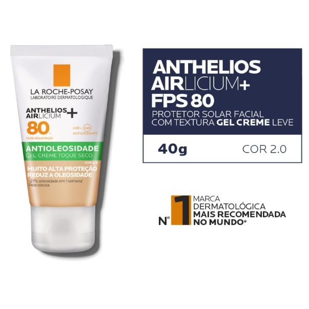 Protetor Solar Facial Anthelios Airlicium+ La Roche-Posay FPS 80 Cor 2.0 40g: alta proteção UVA/UVB com controle do brilho e cobertura leve. Toque seco, ideal para peles mistas a oleosas. Uniformiza o tom da pele e previne sinais do fotoenvelhecimento.
