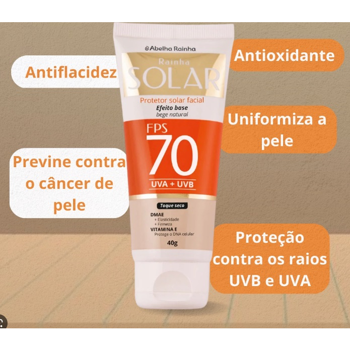 Protetor Solar Facial Efeito Base FPS 70 UVA + UVB + DMAE + Vit E Toque seco 40g - Abelha Rainha