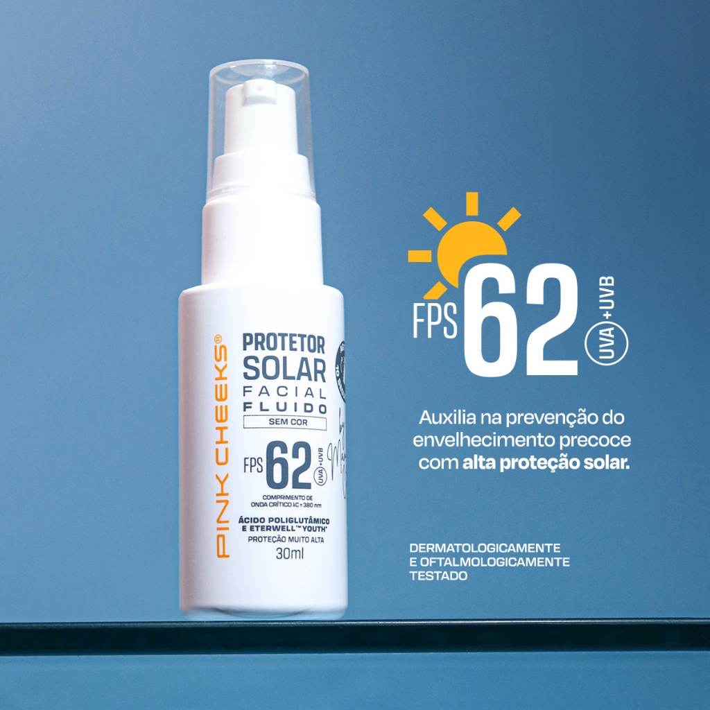 PROTETOR SOLAR FACIAL FLUIDO SEM COR BY MANU CIT FPS 62 FPUVA 35 30ML BENEFÍCIOS E RESULTADOS FPS 62 e FPUVA 35 Para peles jovens, como a da Manu Cit, e maduras, como a da Mama Cit Acabamento leve e confortável Auxilia na prevenção do envelhecimento precoce de peles jovens Ajuda a restaurar a saúde de peles maduras Com ação well-aging, ajuda a preservar a juventude funcional da pele Promove hidratação intensa e prolongada Indicado para todos os tipos de pele, especialmente mistas e oleosas Potencializado com Ácido Poliglutâmico e Eterwell Youth Resistente à água e ao suor Não comedogênico e não acnegênico Dermatologicamente e oftalmologicamente testado DESCRIÇÃO O PROTETOR SOLAR FACIAL FLUIDO da PINK CHEEKS foi pensado para peles jovens, como a da Manu Cit, que dia após dia, têm de resistir à rotina múltipla e acelerada da geração Z. E para peles maduras, como a da Mama Cit, ou melhor, Franciele Cit, que foram expostas por anos ao sol. A primeira, se preocupa com os impactos negativos da exposição à radiação solar na pele e pede por prevenção. Já a segunda, busca soluções para reverter os sinais do envelhecimento por meio da regeneração. Com FPS 62 e FPUVA 35, ele blinda a pele contra a radiação UVA e UVB, que penetram profundamente na pele e aceleram o envelhecimento cutâneo, degradam a produção de colágeno e aumentam o risco de formação de câncer de pele. Além da textura leve, o destaque está na fórmula, que conta com Ácido Poliglutâmico, responsável por aumentar a hidratação de forma intensa e prolongada, e Eterwell® Youth — que previne o envelhecimento de peles jovens e restaura o equilíbrio de peles maduras. Juntos, entregam ação well-aging, que atua na biologia do envelhecimento cutâneo, ajudando a preservar a juventude funcional da pele. Indicado para peles acneicas, é não comedogênico e não acnegênico, com textura leve e acabamento incolor. Além disso, é dermatologicamente e oftalmologicamente testado. POR DENTRO DA FÓRMULA Ácido Poliglutâmico: forma um filme biomimético hidrofílico sobre a pele, reduz a perda de água transepidérmica (TEWL), mantém o conforto cutâneo mesmo sob exposição solar e entrega hidratação intensa e prolongada. Eterwell® Youth: ativo vegetal que atua nos mecanismos da senescência cutânea, auxiliando na redução de marcadores associados ao SASP (fenótipo secretor associado à senescência), protegendo as células contra o estresse oxidativo induzido pela radiação UV e contribuindo (ou auxiliando) para a manutenção da idade biológica da pele. Filtros de amplo espectro: Sistema híbrido de fotoproteção, que abrange os raios UVA/UVB, com alta fotoestabilidade. Filtros Inorgânicos: Filtros solares de origem mineral (dióxido de titânio e óxido de zinco) que protegem a pele contra os danos causados pelos raios solares. Filtros Químicos: filtros solares de origem orgânica que protegem a pele contra os danos causados pelos raios solares. Não contém Avobenzona, Oxibenzona, Octissalato, Homossalato, Amiloxate, Octocrileno e Polisilicone. MODO DE USO Agite por 10 segundos. Depois, aplique o produto uniformemente sobre todo o rosto, espalhe com os dedos, pincel ou esponja. Reaplicar a cada 2 (duas) horas, conforme recomendado pela Sociedade Brasileira de Dermatologia, no decorrer da exposição ao sol, após transpiração excessiva ou permanência prolongada na água, para assegurar maior proteção e manutenção da performance do produto. COMO REMOVER O PRODUTO? Use um removedor de maquiagem de sua preferência, como demaquilante, água micelar ou cleansing oil, para retirar o produto do rosto. Depois, aplique seu sabonete facial preferido realizando movimentos suaves e circulares. Caso necessário, repita o processo para garantir que todos os resíduos sejam eliminados. A limpeza completa evita a obstrução dos poros, o surgimento de cravos e espinhas, além de manter a saúde da pele. ADVERTÊNCIAS É necessária a reaplicação do produto para manter sua efetividade. Ajuda a prevenir queimaduras solares. Uso adulto. Este produto não oferece nenhuma proteção contra a insolação. Evite exposição prolongada das crianças ao sol. Aplique abundantemente antes da exposição ao sol. Conforme recomendado pela Sociedade Brasileira de Dermatologia, reaplicar a cada 2 (duas) horas no decorrer da exposição ao sol, após transpiração intensa, nadar ou banhar-se, e secar-se com toalha. Se a quantidade aplicada não for adequada, o nível de proteção será significativamente reduzido. Manter fora do alcance de crianças. Em caso de irritação, suspender o uso e procurar orientação médica. Em caso de contato com os olhos, enxágue com água em abundância. USO EXTERNO.