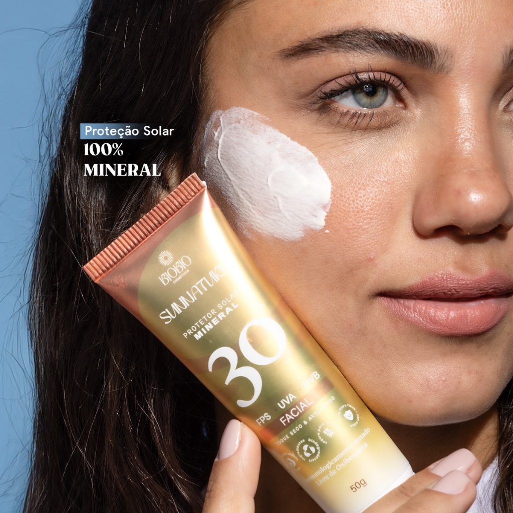 Protetor Solar Físico Mineral Sunnature FPS 30 BioBio — proteção inteligente que cuida da sua pele e do planeta. Desenvolvido para quem busca aliar eficácia, leveza e sustentabilidade, o Sunnature FPS 30 oferece uma defesa elevada contra os raios UVA, UVB e luz azul, com FPS 30 + UVA16 e PPD ≥ 50, garantindo proteção eficiente e confortável. Por que ele é ideal para você: O Sunnature Facial da BioBio é um protetor solar com 99,01% de origem natural com FPS 30 e UVA 16 que protege dos raios solares e da luz azul enquanto trata a pele com potentes ativos naturais, evitando o envelhecimento precoce, flacidez e manchas. Além disso, é composto de filtros 100% físicos, e sua fórmula biodegradável livre de oxibenzona, petrolato, silicone ou filtros hidrossolúveis, limitando os impactos ambientais. Efeito blur instantâneo: promove uniformização da pele e disfarce de imperfeições—ótimo como base pré-maquiagem. Toque seco e textura leve: sensação aveludada sem oleosidade ou resíduos. Potência antioxidante com ativos de skincare: óleo de coco, chá verde, camomila, vitamina E e aloe vera hidratam e protegem. Segurança dermatológica: testado para peles sensíveis e oleosas — uso diário liberado. Ingredientes chave: Óleo de Coco, Extrato de Chá Verde, Camomila, Vitamina E, Aloe Vera, Óxido de Zinco e Dióxido de Titânio. Como usar: Aplique generosamente 15-30 minutos antes da exposição solar. Reaplique a cada 2 horas ou após sudorese intensa. Uso diário facial e corporal. Invista na sua proteção com consciência — escolha Sunnature mineral vegano!
