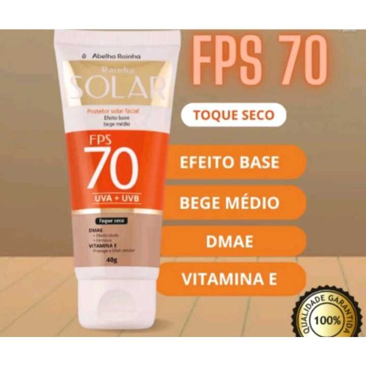 1-Protetor Solar Facial FPS 70 Base Bege Médio 40g Com DMAE Proteção contra os raios UVB e UVA DMAE: + Elasticidade + Firmeza toque seco Vitamina E: protege o DNA celular; Antiflacidez; Antioxidante; Previne contra o câncer de pele; Uniformiza a pele. Modo de Uso: Aplique uniformemente sobre a pele facial seca antes da exposição solar, até obter a cobertura desejada. Reaplique após nadar, banhar-se, secar-se com toalha, sudorese intensa ou tempo de exposição prolongada ao sol. É necessária a reaplicação do produto Restrições: Não usar sobre áreas irritadas ou feridas. Suspender o uso se surgir irritação procurar orientação médica. Ótimas compras!!!