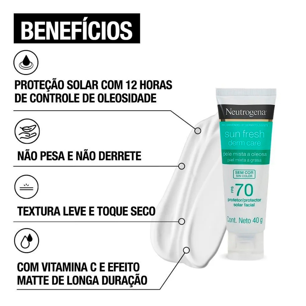 Kit com protetor solar e gel de limpeza facial. Neutrogena Sun Fresh Purified Skin garante uma pele limpa e hidratada, além de proteger dos raios UVA e UVB. O Kit Neutrogena Sun Fresh Purified Skin une dois produtos essenciais para uma boa rotina de cuidados com a derme. As fórmulas ajudam a equilibrar a oleosidade do rosto, purificam, previnem o envelhecimento precoce e as marcas causadas pelo sol. Conselho de Aplicação: Aplique o gel sobre o rosto úmido e massageie em movimentos circulares. Enxágue por completo. Aplique o protetor uniformemente na pele do rosto. É necessária a reaplicação do produto a cada 2 horas para manter sua efetividade. Reaplicar sempre após sudorese intensa, nadar ou banhar-se, secar-se com toalha e durante a exposição ao sol. O protetor solar é o último passo da rotina de cuidados com a pele, aplique após o hidratante e antes da maquiagem. Além disso, precisa ser usado diariamente, mesmo nos dias nublados, já que os raios UV incidem sobre a nossa pele todos os dias.