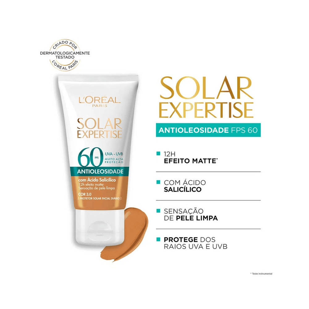 PROTETOR SOLAR FACIAL L'ORÉAL PARIS EXPERTISE ANTIOLEOSIDADE FPS 60 COR MÉDIA 40G ================================================================================= O Protetor Solar Facial L'Oréal Paris Expertise oferece proteção elevada contra os raios solares, prevenindo o envelhecimento precoce. Ideal para peles oleosas, possui fórmula enriquecida com ácido salicílico que ajuda a controlar a oleosidade. Com FPS 60, este protetor solar garante alta proteção contra os nocivos raios UVA e UVB. O ácido salicílico presente na fórmula combate o excesso de oleosidade, garantindo uma pele mais limpa e fresca por todo o dia. ALTA PROTEÇÃO CONTRA RAIOS SOLARES Com FPS 60, este protetor solar garante alta proteção contra os nocivos raios UVA e UVB. CONTROLE AVANÇADO DE OLEOSIDADE O ácido salicílico presente na fórmula combate o excesso de oleosidade, garantindo uma pele mais limpa e fresca por todo o dia. MODO DE USO =========== Aplique o protetor facial diariamente, especialmente antes da exposição ao sol, para garantir a proteção adequada. Coloque uma quantidade adequada do produto no rosto, evitando a área dos olhos. Espalhe gentilmente o protetor solar por toda a face até que seja completamente absorvido. Reaplique o produto a cada duas horas ou após sudorese intensa e exposição à água. Para melhores resultados, utilize o produto diariamente, mesmo em dias nublados. APLICAÇÃO Coloque uma quantidade adequada do produto no rosto, evitando a área dos olhos. ESPALHANDO O PRODUTO Espalhe gentilmente o protetor solar por toda a face até que seja completamente absorvido. REAPLICAÇÃO Reaplique o produto a cada duas horas ou após sudorese intensa e exposição à água. USO CONTÍNUO Para melhores resultados, utilize o produto diariamente, mesmo em dias nublados. CARACTERÍSTICAS E BENEFÍCIOS DO PROTETOR SOLAR FACIAL L'ORÉAL PARIS =================================================================== Este protetor solar é ideal para o uso diário, especialmente em ambientes urbanos ou ao ar livre. Proporciona alta proteção eficaz contra os danos causados pelos raios solares. Ajuda no controle da oleosidade da pele, mantendo-a limpa e fresca durante o dia. Uniformiza o tom da pele enquanto protege, sendo ideal para quem busca praticidade. Garantia de segurança e eficácia comprovada para todos os tipos de pele oleosa. FPS 60 Proporciona alta proteção eficaz contra os danos causados pelos raios solares. ÁCIDO SALICÍLICO Ajuda no controle da oleosidade da pele, mantendo-a limpa e fresca durante o dia. COBERTURA COM COR MÉDIA Uniformiza o tom da pele enquanto protege, sendo ideal para quem busca praticidade. TESTADO DERMATOLOGICAMENTE Garantia de segurança e eficácia comprovada para todos os tipos de pele oleosa. ESPECIFICAÇÕES TÉCNICAS ======================= Compacto e fácil de transportar, esse protetor vem em embalagem prática tipo tubo squeeze. Tipo de Produto: Protetor Solar FPS: FPS 60 Peso Líquido: 40g Uso Indicado: Diário para peles oleosas Formato da Embalagem: Tubo squeeze Áreas: Para Rosto SOBRE A MARCA L'ORÉAL PARIS =========================== A L'Oréal Paris é reconhecida mundialmente por sua expertise em cuidados de beleza e inovação em produtos de maquiagem e cuidado da pele. Seus produtos são desenvolvidos com tecnologias avançadas que garantem a eficácia e a segurança para todos os tipos de pele. A marca investe constantemente em pesquisa e desenvolvimento para oferecer produtos de alta performance. Os produtos são testados dermatologicamente, garantindo segurança e eficácia. Oferece uma ampla gama de produtos que atendem diferentes necessidades e preferências. INOVAÇÃO A marca investe constantemente em pesquisa e desenvolvimento para oferecer produtos de alta performance. QUALIDADE Os produtos são testados dermatologicamente, garantindo segurança e eficácia. VARIEDADE Oferece uma ampla gama de produtos que atendem diferentes necessidades e preferências.