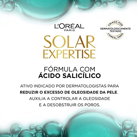 O NOVO L’ORÉAL PARIS SOLAR EXPERTISE Antioleosidade FPS 30 é um protetor solar facial de uso diário desenvolvido especialmente para peles oleosas. Sua fórmula possui filtros solares de altíssima eficácia que entrega alta proteção contra os raios UVA/UVB e Ácido Salicílico, ativo muito utilizado por dermatologistas para reduzir o excesso de oleosidade, garantindo assim uma sensação de pele limpa com 12h de efeito matte e prevenindo o envelhecimento cutâneo provocado pela exposição ao sol (rugas e manchas solares). Além de alta proteção UVA/UVB contra os efeitos do sol, possui textura leve e fácil de espalhar. Sua fórmula com Ácido Salicílico de alta tecnologia controla a oleosidade com efeito matte 12h, possui rápida absorção oil-free e resistência à água. BENEFÍCIOS: - Controla a oleosidade. 12h de efeito matte. - Textura leve, fácil de espalhar e oil free. - Alta proteção contra raios UVA e UVB - Previne o envelhecimento solar - Previne rugas e manchas solares - Previne contra queimaduras de sol - Reduz o brilho - Rápida absorção