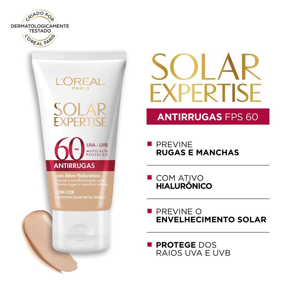 Protetor Solar Facial L'Oréal Solar Expertise Antirrugas FPS 60 com Cor 40g L’ORÉAL PARIS SOLAR EXPERTISE Antirrugas FPS 60 com cor é um protetor solar facial de uso diário desenvolvido para todos os