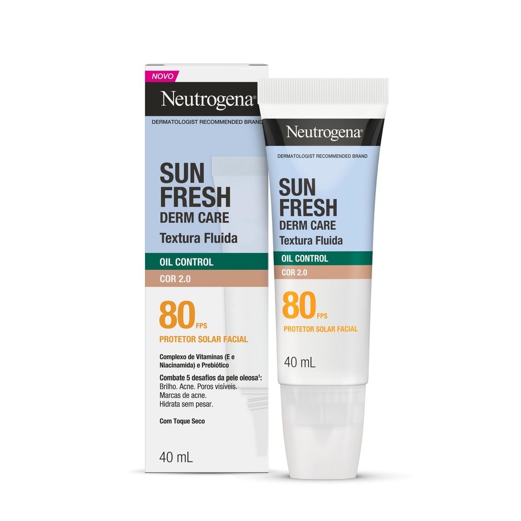 NEUTROGENA SUN FRESH® Oil Control Fluido FPS 80 COR 2.0: Indicado para peles oleosas e acneicas, possui textura ultrafluida e efeito matte, além de oferecer acabamento natural e combater os cinco desafios da pele oleosa: controla o brilho, previne a acne, diminui os poros e ameniza as marcas de acne, além de hidratar sem pesar. Com a exclusiva tecnologia HELIOPLEX™ SL, oferece muito alta proteção, forma uma barreira protetora contra raios UV, ajuda a proteger contra a luz visível e poluição, protegendo a vitalidade da pele e reverte danos solares, entregando um boost de nutrição e vitaminas. Com Niacinamida: ativo clareador de sinais causados pelo sol; Vitamina E: antioxidante.