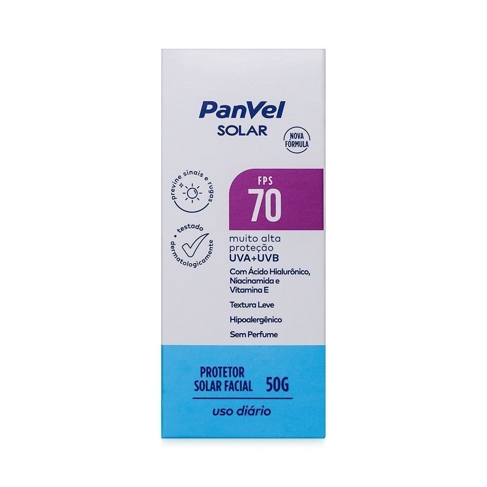 Conteúdo: 50G FPS70 Alta proteção Para que serve o Protetor Solar Panvel? O Protetor Solar Facial Panvel FPS 70 possui textura leve e de rápida absorção, sem cor, garante proteção contra as radiações UVA e UVB e do envelhecimento causado pela exposição solar, próprio para ser usado diariamente. Enriquecido com Ácido Hialurônico e Vitamina E que hidratam, protegem e auxiliam na manutenção da elasticidade da pele. Contém Niacinamida, que promove o clareamento, uniformização da pele e ação antirrugas. Indicado para todos os tipos de pele, principalmente as extremamente sensível a queimadura solar. Quais os benefícios do Protetor Solar Panvel? Rápida Absorção; Resistente a Água e Suor; Textura Leva; Com Vitamina E e extrato Aloe Ver; Previne o fotoenvelhecimento da pele; Dermatologicamente testado. Modo de uso Aplique abundantemente e uniformemente sobre a pele seca, em todas as áreas a serem expostas ao sol, 30 minutos antes da exposição. Após o uso, aguarde a secagem. É necessária a reaplicação do produto para manter a sua efetividade. Reaplicar sempre, após sudorese intensa, nadar ou banhar-se, secar-se com toalha e durante a exposição ao sol.