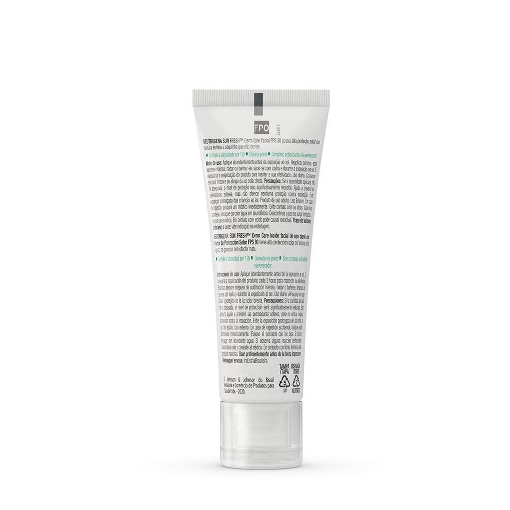 O que é e para que serve? Protetor Solar Facial Para Pele Oleosa NEUTROGENA SUN FRESH® Derm Care sem cor FPS 30, 40g, controla a oleosidade por 12h, com complexo antioxidante rejuvenescedor e efeito matte de longa duração. Com textura ultraleve e sequinha que não derrete. A exclusiva tecnologia HELIOPLEX®XP oferece alta proteção ampla e eficaz contra os raios UVB, UVA e ajuda contra a luz visível. Benefícios e diferenciais Com sílica que atua na oleosidade da pele; Complexo antioxidante rejuvenescedor formado por: -> Niacinamida: ativo clareador de sinais causados pelo sol; -> Feverfew: Poderoso antioxidante; -> Vitamina C: Antioxidante; Dermatologicamente testado. Não comedogênico e não obstrui poros. Como usar Aplique abundantemente antes da exposição ao sol. Reaplicar sempre, após sudorese intensa, nadar ou banhar-se, secar-se com toalha e durante a exposição ao sol. *É necessária a reaplicação do produto a cada 2 horas para manter a efetividade da proteção solar. Uso diário. Conservar em local fresco e ao abrigo da luz solar direta. Composição Substancias ativas: Octocrylene, Butyl Methoxydibenzoylmethane, Homosalate, Ethylhexyl Salicylate, Ethylhexyl Triazone, Methylene Bis-Benzotriazolyl Tetramethylbutylphenol, Titanium Dioxide, Bis-Ethylhexyloxyphenol Methoxyphenyl Triazine Precauções Uso Externo. Evite contato com os olhos. Caso isso aconteça, enxágue-os com água em abundância. Descontinue o uso se surgirem irritações na pele. Se a quantidade aplicada não for adequada, o nível de proteção será significativamente reduzido. O produto ajuda a prevenir as queimaduras solares, mas não oferece nenhuma proteção contra a insolação. Evite exposição prolongada das crianças ao sol. Para crianças menores de 6 (seis) meses, consultar um médico. Conserve fora do alcance das crianças. Em contato com tecido, pode causar manchas.