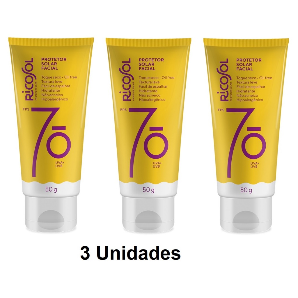 RICOSOL PROTETOR SOLAR FACIAL FPS 70 50 g Especialmente formulado para prevenir os sinais do envelhecimento precoce da pele causadas pelo sol. Proteção muito alta contra a radiação UVB e UVA Rapidamente absorvido pela pele Muito resistente à água Contém Aloe Vera com ação hidratante MODE DE USAR Agite antes de usar. Uso diário. Aplique abundantemente antes da exposição ao sol. É necessária a reaplicação do produto para manter a sua efetividade. Reaplicar sempre, após sudorese intensa, nadar ou banhar-se, secar-se com toalha e durante a exposição ao sol. Se a quantidade aplicada não for adequada, o nível de proteção será significativamente reduzido. Indicado para pele extremamente sensível à queimadura solar. PRECAUÇÕES Uso externo. Mantenha fora do alcance das crianças, em local seco e fresco. Ajuda a prevenir as queimaduras solares. Evite contato com os olhos. Em contato com tecidos (roupas) pode causar manchas. Em caso de ingestão acidental do produto, procure um médico. Para crianças menores de 6 (seis) meses, consultar um médico. Evite exposição prolongada das crianças ao sol. Este produto não oferece nenhuma proteção contra insolação. Produto formulado de maneira a minimizar possível surgimento de alergia. Suspenda o uso em caso de irritação na pele. Não utilize se for sensível a algum dos componentes da fórmula. COMPOSIÇÃO Aqua, Ethylhexyl Salicylate, Octocrylene, Butyl Methoxydibenzoylmethane, Cetearyl Isononanoate, Ethylhexyl Triazone, Potassium Cetyl Phosphate, Titanium Dioxide, Butyloctyl Salicylate, C12-15 Alkyl Benzoate, Dicaprylyl Carbonate, Cyclopentasiloxane, Aluminum Starch Octenylsuccinate, Methylene Bis-Benzotriazolyl Tetramethylbutylphenol, Butylene Glycol, Triacontanyl PVP, Dimethicone, Silica, Phenoxyethanol, Triethanolamine, Decyl Glucoside, Acrylates/ C10-30 Alkyl Acrylate Crosspolymer, Tocopheryl Acetate, Cetearyl Alcohol, Glyceryl Stearate, Cetyl Palmitate, Xanthan Gum, Carbomer, Disodium EDTA, Parfum, Pentaerythrityl Tetra-di-t-butyl Hydroxyhydrocinnamate, Propylene Glycol, Methylisothiazolinone, Aloe barbadensis Leaf Powder.