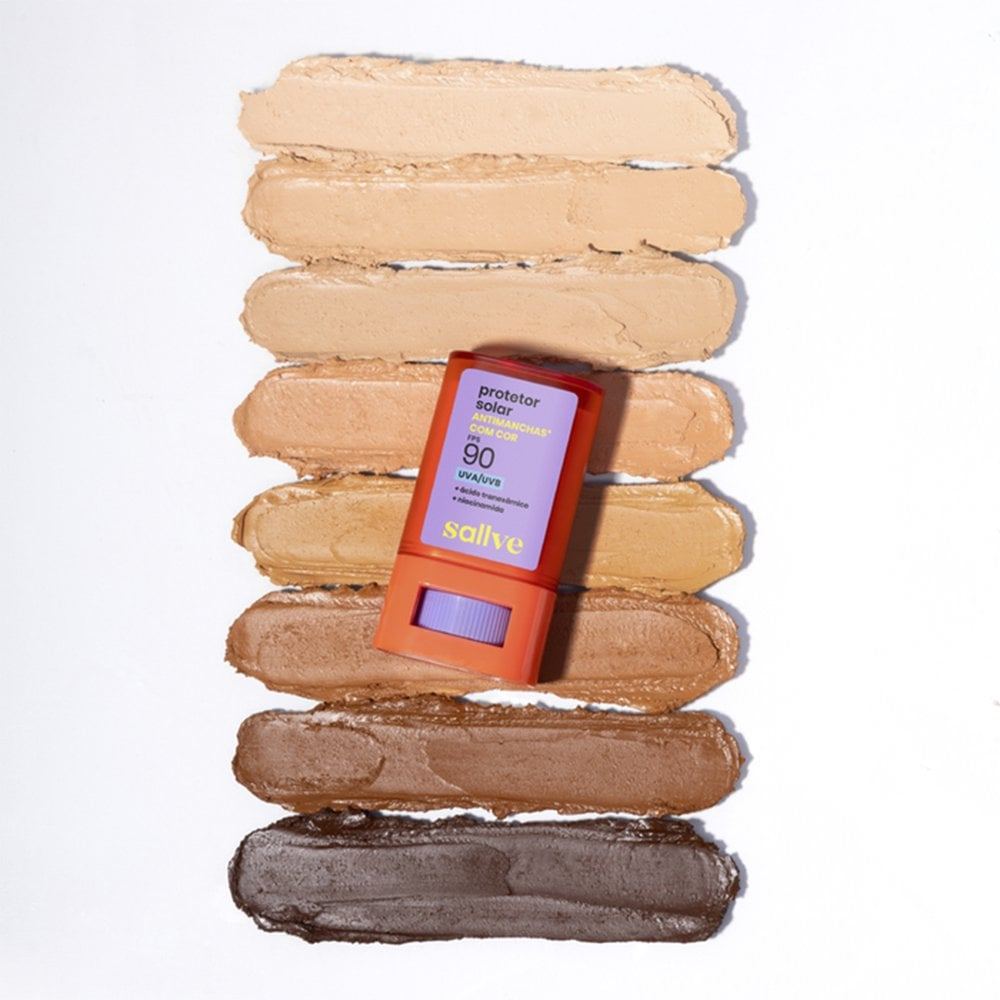 Protetor Solar Facial Sallve Stick FPS 90 cor 03 15g O que é e para que serve? Um Protetor Solar com cor em formato prático de bastão, que protege, uniformiza e trata em uma passada. Tem alta proteção solar FPS 90 UVA/UVB PA++++, muito alta proteção contra luz visível e alta resistência à água e ao suor. Com ácido tranexâmico e niacinamida na fórmula, conta com uma poderosa ação antimanchas, que potencializa o tratamento contra manchas solares. Disponível em 8 tonalidades, tem uma cobertura média, que permite a construção de camadas e garante uma pele uniforme, mas sem brilho excessivo. Quais os Benefícios do Protetor Solar Sallve Antimanchas? - Oferece muito alta proteção contra os raios UVA/UVB e luz visível; - Formulado com ácido tranexâmico, ajuda na uniformização da pele regulando a produção excessiva de melanina; - Proporciona cobertura média ajustável conforme desejado; - Enriquecido com niacinamida e carnosina que hidratam profundamente enquanto protegem contra danos causados pela radiação infravermelha (IR), azul e visível; - Não deixa brilho excessivo na pele garantindo acabamento suave. Ativos: Ácido Tranexâmico: Conhecido ativo uniformizador, ajuda a regular a produção de melanina e, assim, suavizar manchas. Age interagindo com uma enzima da nossa pele, conhecida por estimular uma maior produção de melanina em resposta a inflamações, exposição solar, acne, entre outros. Niacinamida: Regula a liberação da melanina reduzindo a hiperpigmentação. Por ser um ativo com benefícios múltiplos, também hidrata, fortalece a barreira cutânea, controla a oleosidade e tem ação antioxidante. Carnosina: Além de ser antioxidante, protege contra os danos da radiação IR, azul e visível, ajudando a preservar a estrutura da pele e prevenir a hiperpigmentação. Também é antiglicante e age para preservar o colágeno, diminuir a produção de radicais livres e prevenir os sinais do tempo. Quercetina: Substância do grupo dos flavonóides, possui alta atividade antioxidante e oferece proteção frente aos radicais livres gerados pela radiação UV. Modo de Uso: 1. Aplique o protetor solar sobre toda a pele espalhando bem para cobrir rosto, orelhas, pescoço, nuca e colo. 2. Para uma maior cobertura, reaplique o produto, construindo camadas, quantas vezes achar necessário. Especificações Linha: Proteção Solar Tipo De Pele: Todos os Tipos de Pele