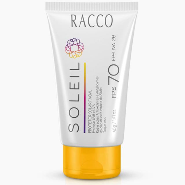 | Protetor Solar Facial Soleil Racco Fps 70 Alta Proteção Filtro Uva ... este produto | R$ 67,90 | 32% | 4.9/5 | 6 |