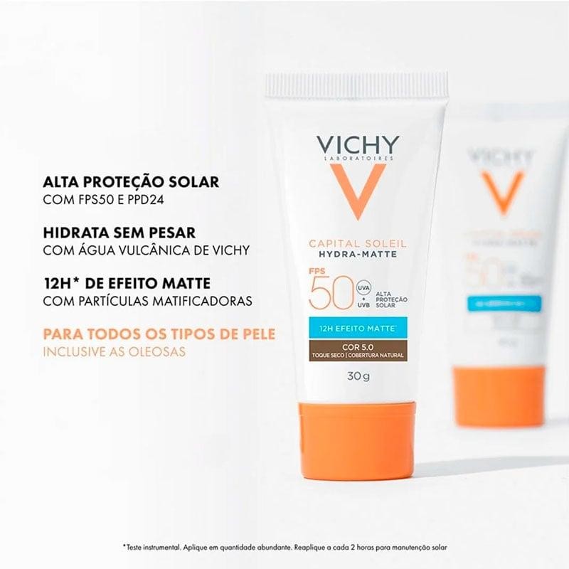 Protetor Solar Facial Vichy Hydra-Matte FPS50 Cor 5.0 – Proteção, Hidratação e Acabamento Matte Vichy V Capital Soileil Hydra- Matte FPS50 protege a pele dos raios UVA e UVB com efeito matte por até 12 horas, sendo indispensável para uma rotina completa de cuidados com a derme. O Protetor Solar Vichy V Capital Soileil Hydra- Matte FPS50 possui uma consistência leve, com toque seco que elimina o brilho durante o dia. Além disso, sua composição tem água vulcânica Vichy que realiza uma hidratação eficaz e não pesa a cútis. Vichy traz soluções para completar o cuidado com uma expertise máxima. Sobre a Marca: A Vichy é reconhecida mundialmente por sua expertise em cuidados dermatológicos e sua linha de protetores solares Hydra-Matte foi desenvolvida especialmente para quem deseja proteção solar avançada com acabamento natural e sequinho, atendendo às necessidades de peles oleosas e mistas. Com produtos que combinam eficácia e alta tecnologia, a marca se compromete a oferecer os melhores cuidados para a pele de seus consumidores. Benefícios do Protetor Solar Vichy Hydra-Matte FPS50 Cor 5.0 - Proteção Solar Avançada: Bloqueia eficazmente os raios UVA e UVB, prevenindo queimaduras solares, manchas e sinais precoces de envelhecimento, com proteção FPS50. - Acabamento Matte Prolongado: Controle da oleosidade por até 12 horas, mantendo sua pele sem brilho e com um toque seco durante todo o dia, perfeito para quem tem pele oleosa ou mista. - Hidratação Balanceada: Combinação de Água Vulcânica de Vichy e Ácido Hialurônico que hidrata profundamente, sem deixar sensação oleosa ou pegajosa, ideal para quem busca uma pele macia e saudável. - Cor Natural e Uniforme: A cor 5.0 oferece um acabamento natural, disfarçando imperfeições e uniformizando o tom da pele com uma cobertura leve e impecável. - Versatilidade no Uso: Pode ser usado sozinho ou como base, proporcionando uma cobertura suave que deixa a pele protegida, com aspecto radiante e saudável, sem pesar. - Resistência ao Suor e Água: Ideal para climas quentes e atividades ao ar livre, esse protetor é resistente ao suor e à água, mantendo sua eficácia mesmo em condições adversas. - Seguro para Pele Sensível: Dermatologicamente testado, o produto é adequado para peles sensíveis, oferecendo proteção sem irritações, e garantindo o cuidado completo da sua pele. Como Usar o Protetor Solar Vichy Hydra-Matte FPS50 Cor 5.0: Aplique abundantemente sobre a pele 30 minutos antes da exposição ao sol. Se a quantidade aplicada não for adequada, o nível de proteção será significativamente reduzido. O que torna o Protetor Solar Vichy Hydra-Matte FPS50 Cor 5.0 diferente de outros protetores solares? Além de oferecer uma proteção solar completa contra os raios UVA e UVB, ele contém água vulcânica de Vichy e Ácido Hialurônico, que ajudam a hidratar a pele de forma equilibrada e eficaz, sem deixá-la oleosa ou pegajosa. Perguntas Frequentes: 1. O Protetor Solar Vichy Hydra-Matte FPS50 Cor 5.0 é ideal para quem tem pele oleosa? Absolutamente! Ele foi desenvolvido para controlar a oleosidade por até 12 horas, garantindo um efeito matte que mantém sua pele fresca e sem brilho ao longo do dia. 2. Posso usar o Protetor Solar Vichy Hydra-Matte FPS50 Cor 5.0 como uma base de maquiagem? Com certeza! Sua cobertura leve e acabamento natural fazem dele uma excelente opção para substituir a base no seu dia a dia, deixando a pele uniforme e protegida. 3. Ele funciona bem em climas quentes e úmidos? Sim, o Vichy Hydra-Matte FPS50 Cor 5.0 é resistente ao suor e à água, sendo perfeito para ser usado em dias quentes, atividades ao ar livre ou até mesmo durante a prática de esportes. 4. Ele pode ser usado por pessoas com pele sensível? Sim! O Vichy Hydra-Matte FPS50 Cor 5.0 é dermatologicamente testado e é seguro para peles sensíveis, proporcionando proteção sem causar irritações ou desconforto. 5. Qual a durabilidade do efeito matte ao longo do dia? O efeito matte do Protetor Solar Vichy Hydra-Matte dura até 12 horas, mantendo sua pele sem brilho e com aparência fresca o dia todo